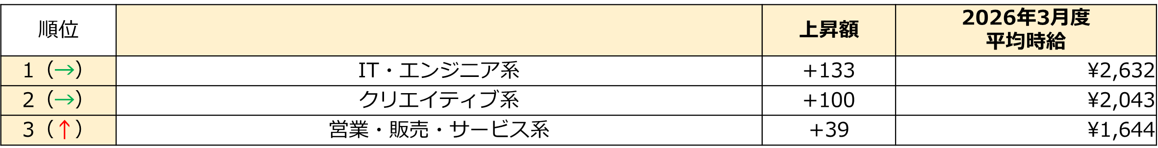 3月度の職種別/前年同月比 時給上昇額ランキング
