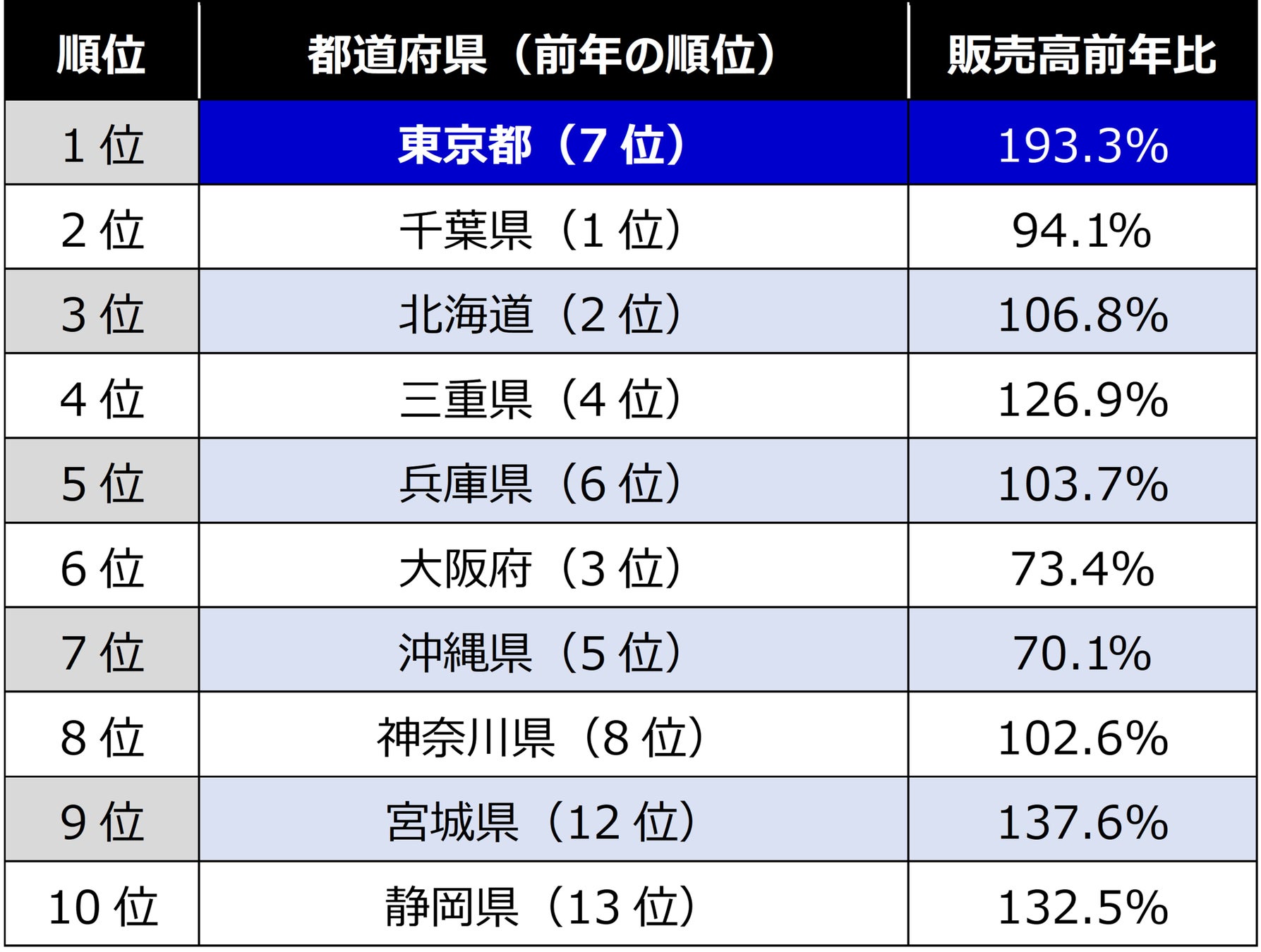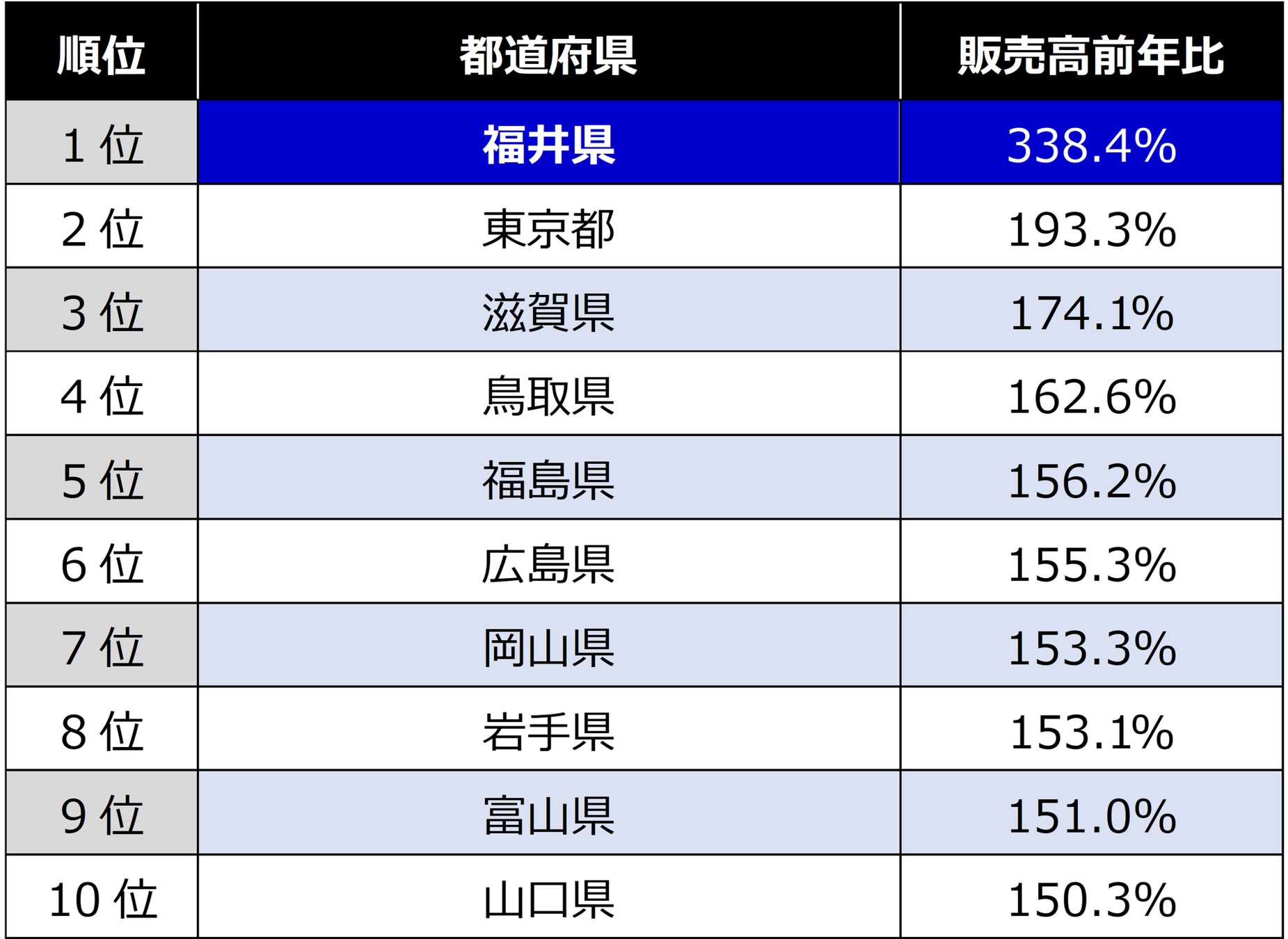 伸び率ランキングを見ると、福井県が販売高前年比3倍超と圧倒的な伸びを見せ、1位を獲得。北陸新幹線延伸の効果もあり、今年の注目エリアになっていることがうかがえます。