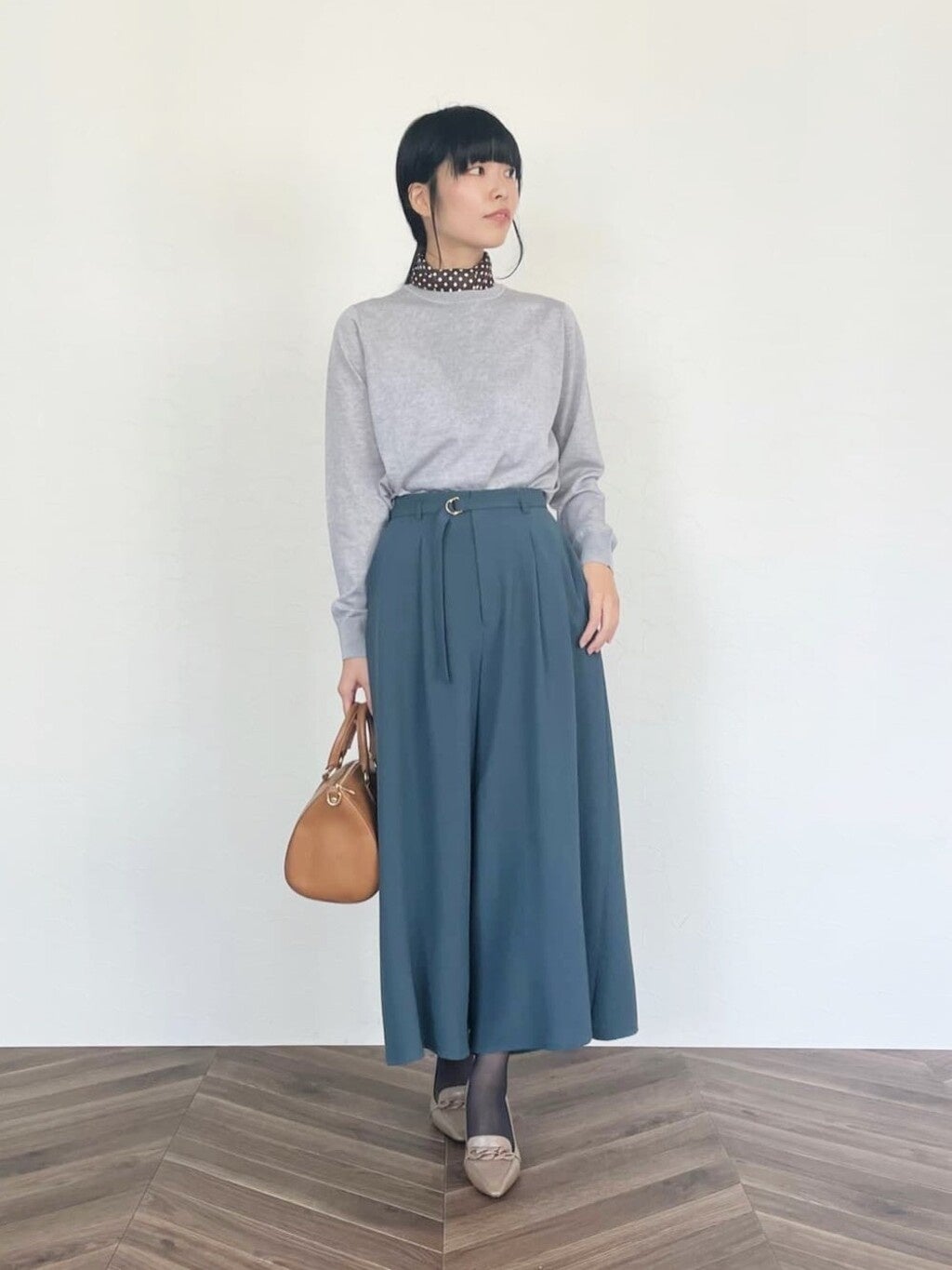 オンオフ兼用できるきれいめカジュアルスタイル。 アトラエルのニットは、ジャケットインナーとしてもおすすめのアイテムですが 着まわしやすいシンプルなデザインでカジュアルボトムとも好相性。 ドット柄のスカートをコンパクトに巻いて、顔周りに華やかさをプラスしてみました。 ボトムは、フレアスカートのようなシルエットが上品なパンツをチョイス。 レッグラインを拾いにくいので、さりげなくスタイルアップできるアイテムです。 ウエスト後ろはゴム仕様でゆとりがありつつ、ベルト付きで腰回りをすっきり見せてくれますよ。 スカーフとパンツ、バッグはNYオンライン限定アイテムです!