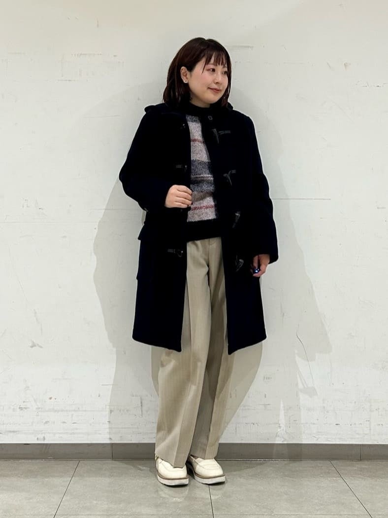 冬の定番ダッフルコートのインナーコーデ。モヘヤ混の温かみのあるタータンニットをインナーに入れ、よりトラッド感あるスタイルにしました。