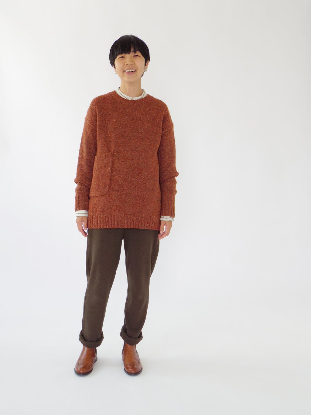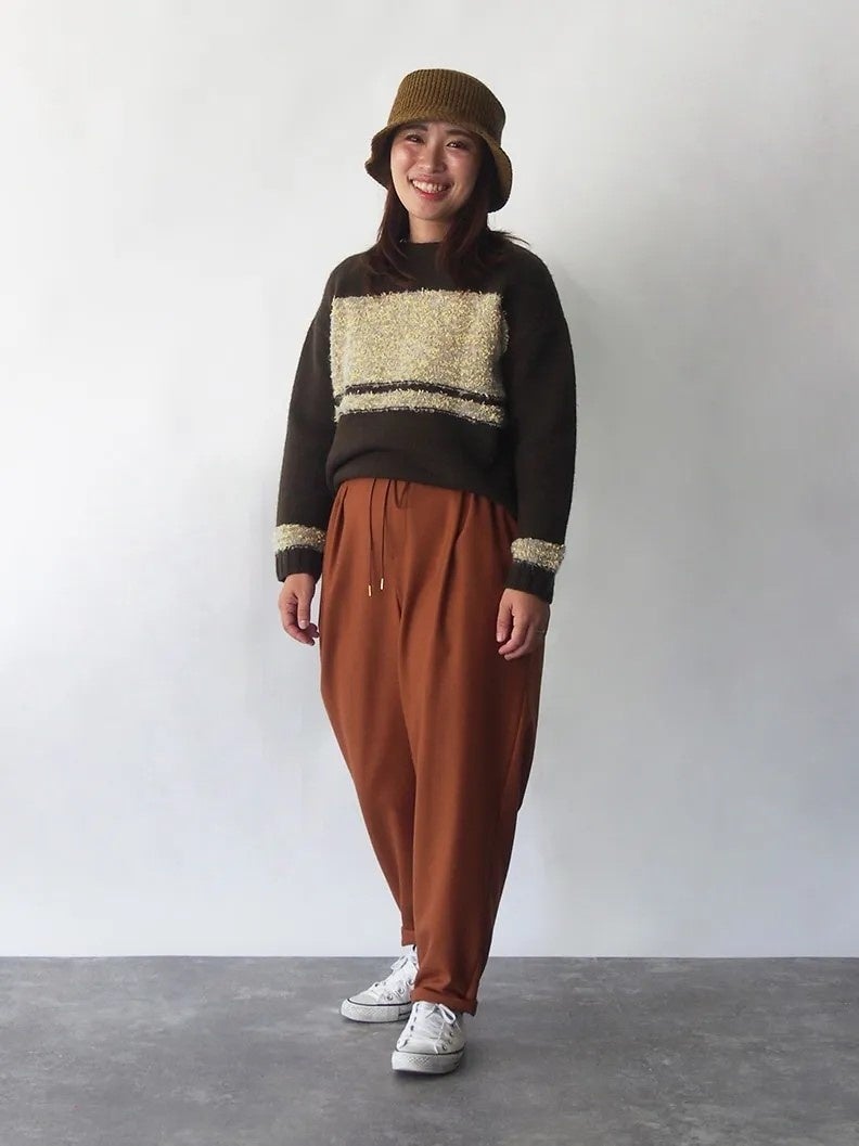 ママ友とお出かけの日は動きやすく 1枚で着映えするニットと、秋カラーが旬なパンツを合わせた こなれコーディネートに。 パンツはあえてワンサイズ上を穿いて ぽわんとしたシルエットを愉しむスタイリングに。 ニットハットを合わせれば、一気にあったかコーデの出来上がり!