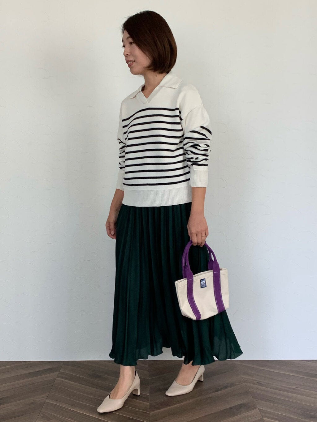 トレンド感のあるボーダー柄のスキッパーカラーニットに、艶感のキレイなアコーディオンプリーツスカートを合わせたキレイめカジュアルスタイル。 カジュアルになりがちなボーダーもキレイめボムやシューズと合わせればカジュアルになりすぎずに着ていただけます。 肌寒くなってきた11月上旬の今くらいの季節にぴったりです。 冬が深まればブレザーやブルゾンをプラスして、旬な休日のカジュアルコーデをお楽しみください!