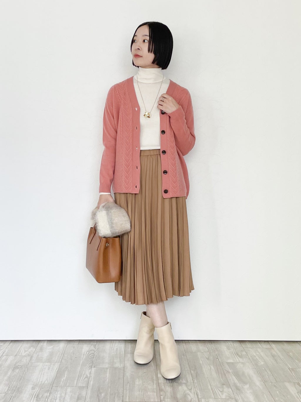 柔らかい雰囲気の暖色コーデ。 オレンジみのあるピンクカラーのカーディガンは 【WEB限定商品】です。 キャメルのプリーツスカートを合わせて、 あたたかみのある女性らしいコーディネートにしました。 グラフィカルモチーフのペンダントをポイントに。