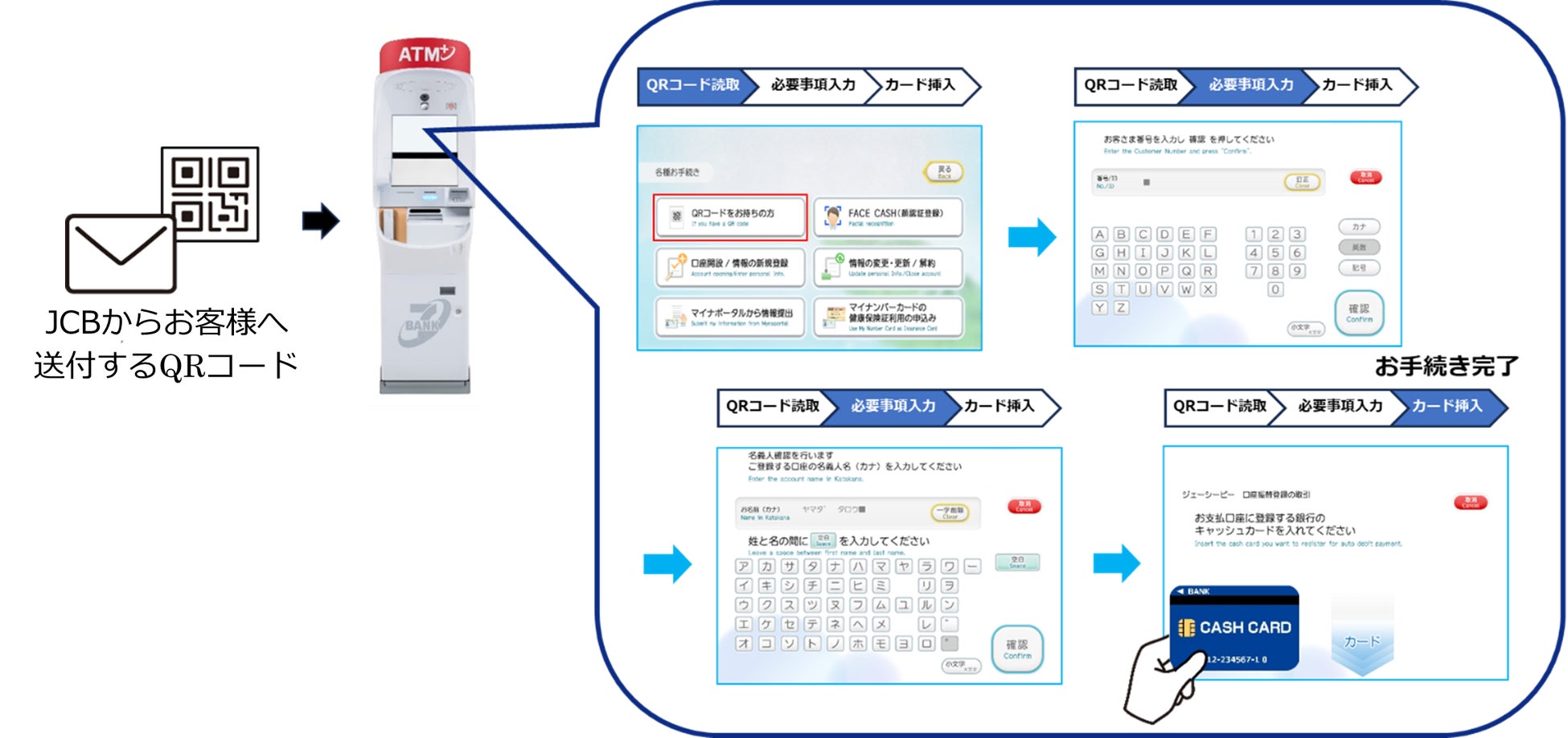 手続きは、JCBから発行されるQRコード※を、セブン銀行ATMにかざした後、必要事項を入力し、支払いに指定する口座のキャッシュカードをATMに挿入するだけで完了します。