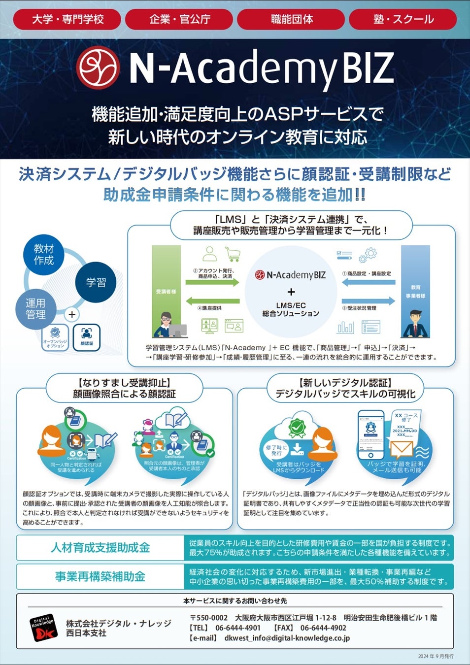 1995年創業のeラーニングシステム専門ソリューション企業、株式会社デジタル・ナレッジ(本社:東京都台東区 西日本支社:大阪府大阪市 代表取締役社長:はが弘明)は、この度、西日本支社発のASP型eラーニングシステム「N-AcademyBIZ」(*1)に人材開発支援助成金(*2)の申請に必要な各種機能をリリースしました。