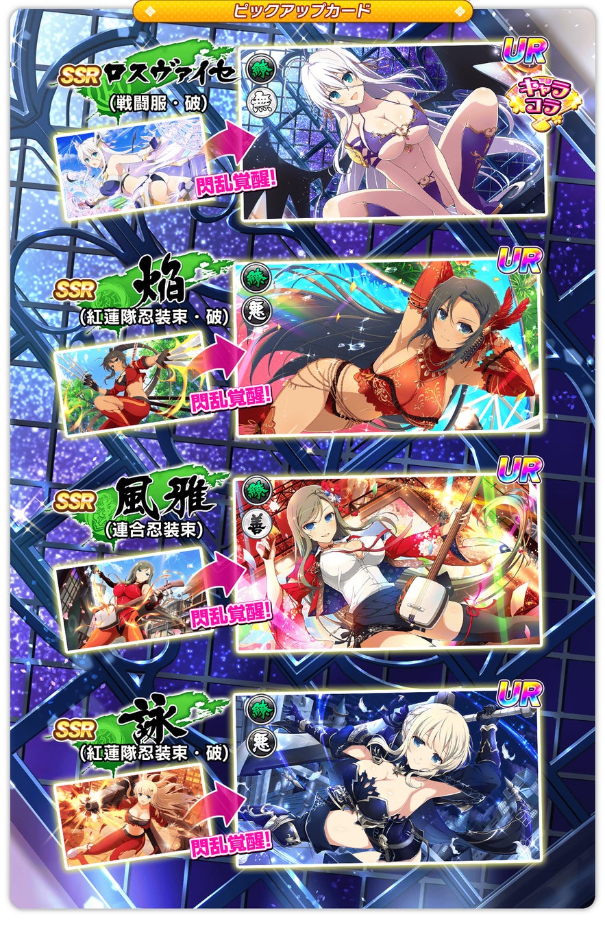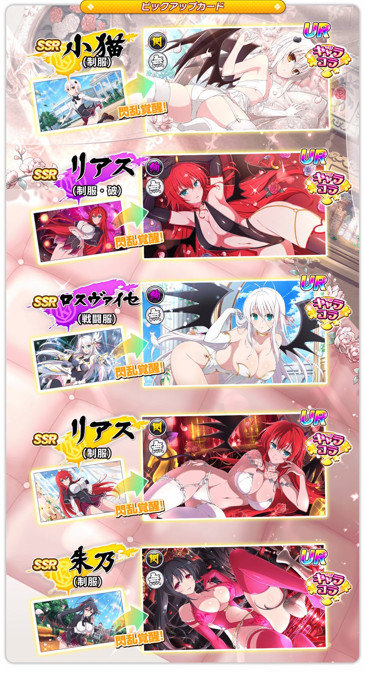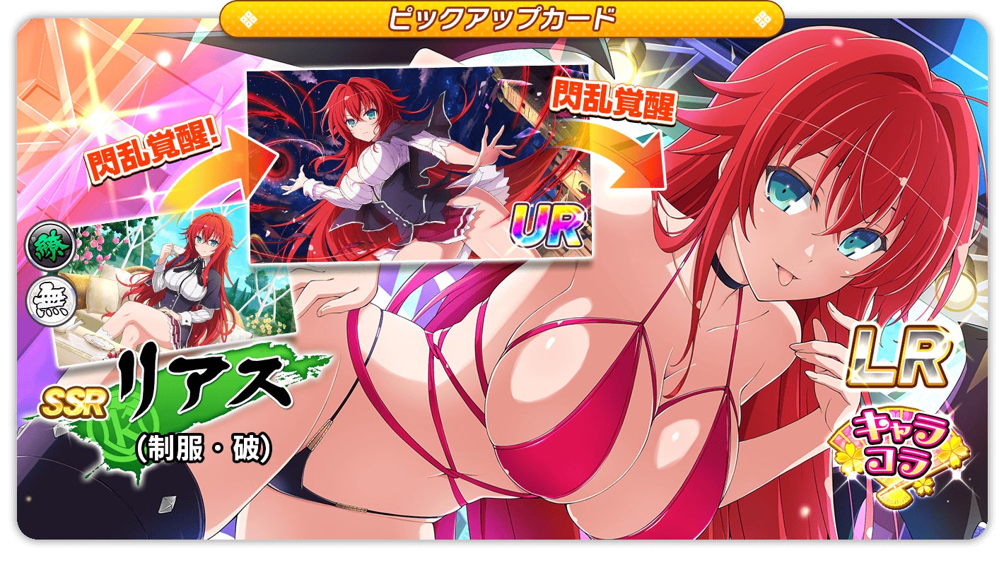 「リアス」「ロスヴァイセ」の新カードが登場し、「リアス」はLRまで覚醒!過去に登場したハイスクールD×Dコラボカード全てが復刻登場!「レヴィアタン」姿の「斑鳩」が手に入るイベントも同時開催中!