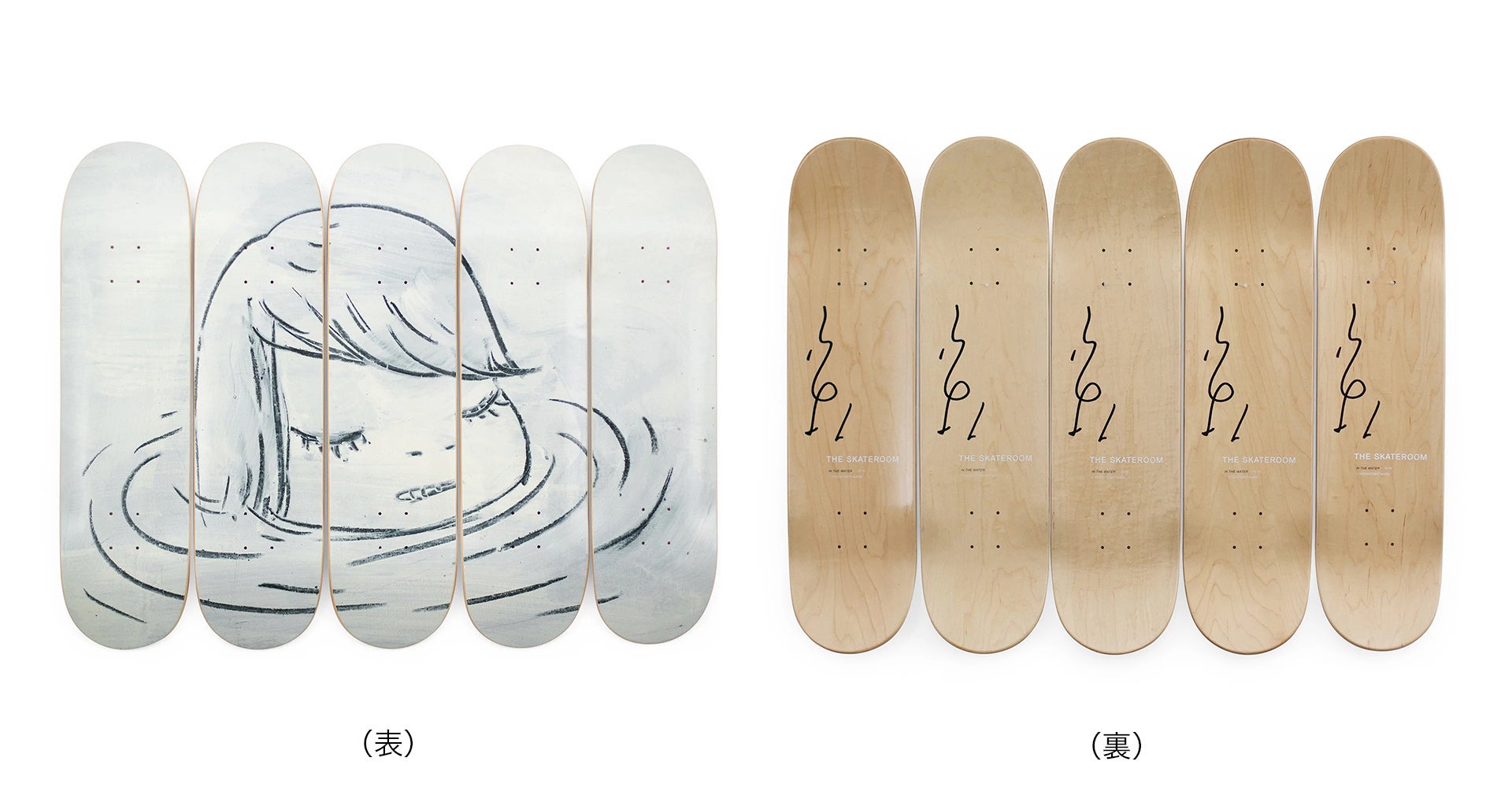奈良美智がアクリル絵具と木炭で描いた『In the Water』(2019年)をあしらったスケートボード5点セット。「頭の大きな女の子」は奈良の代表的なテーマであり、複雑な感情を感じさせる大きく鋭い目で知られていますがが、この作品では目を閉じることで、水の中を歩く女の子が、安心しているのか、大変な状況にあるのか、どんな状態なのかを不明なままにしています。幼少期から絵本が大好きだった奈良のパワフルで曖昧な絵は、人間のイマジネーションをかき立てる力を引き出します。また、彼は日本のサブカルチャーであるマンガやアニメ、テレビゲームに影響を受けています。