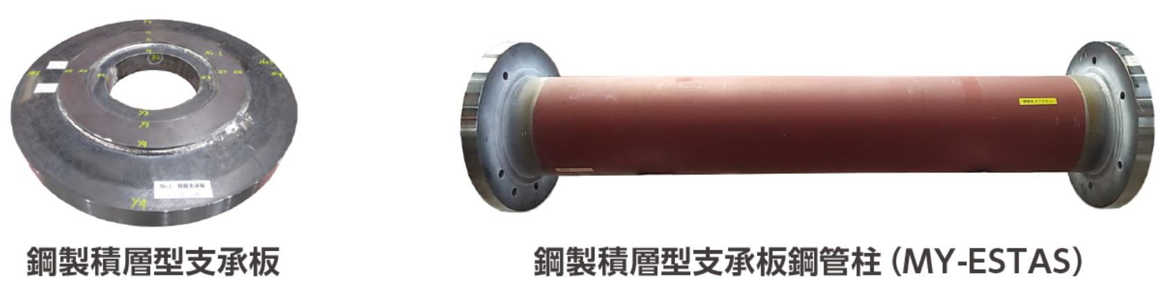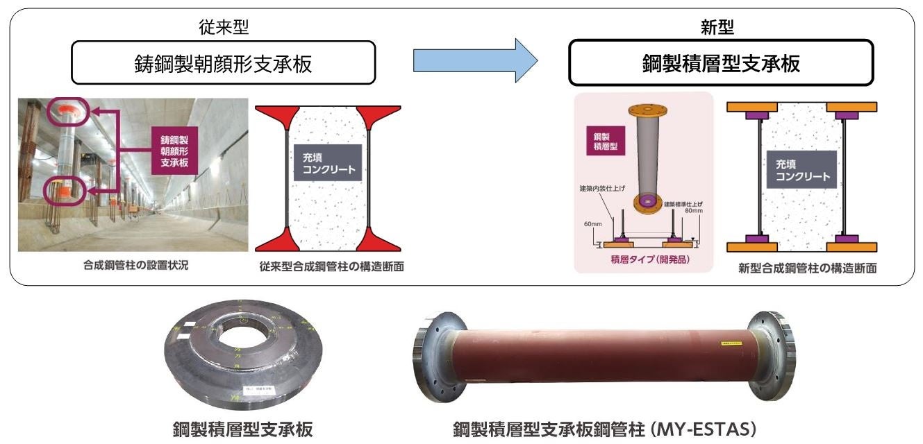 この課題を解決するべく、より効率的に生産でき、従来型と同等の強度を有する、鋼板を積層した鋼製積層型支承板(以下、「鋼製支承板」)の開発実験を3社で行ってきました。実験の結果、これまでの鋳鋼製支承板と同等の性能を確認することができ、このたび、この鋼製積層型支承板鋼管柱を「マイエスタス®(MY-ESTAS)」として製品化しました。