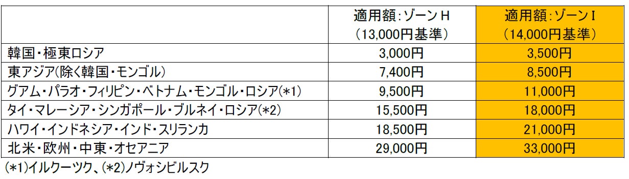 運賃額 : 日本発旅程 (金額はお一人さま一区間片道あたり)