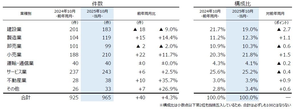 業種別にみると、7業種中4業種で前年を上回った。『サービス業』(前年同月237件→243件、2.5%増)が最も多く、全体の25.2%を占め、2000年以降で3番目に多かった。最も高い増加率を示した『不動産業』(同28件→38件、35.7%増)は、5カ月連続で前年を上回り、過去10年で最多となった。『小売業』(同188件→210件、11.7%増)は、10月としては2008年(231件)以来17年ぶりに200件を上回った。