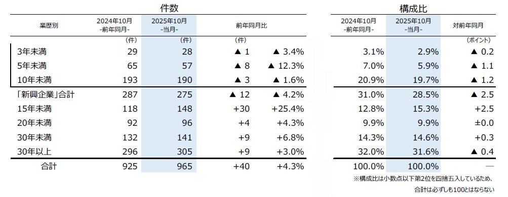 業歴別にみると、「30年以上」が305件(前年同月296件、3.0%増)と全体の31.6%を占め、最多となった。このうち、老舗企業(業歴100年以上)の倒産は12件(同16件、25.0%減)発生した。
