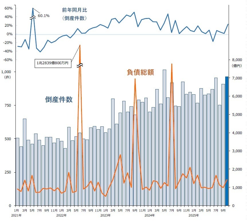 2025年10月の倒産件数、今年最多の965件 12年ぶりに年間1万件超へ ― 全国企業倒産集計2025年10月報