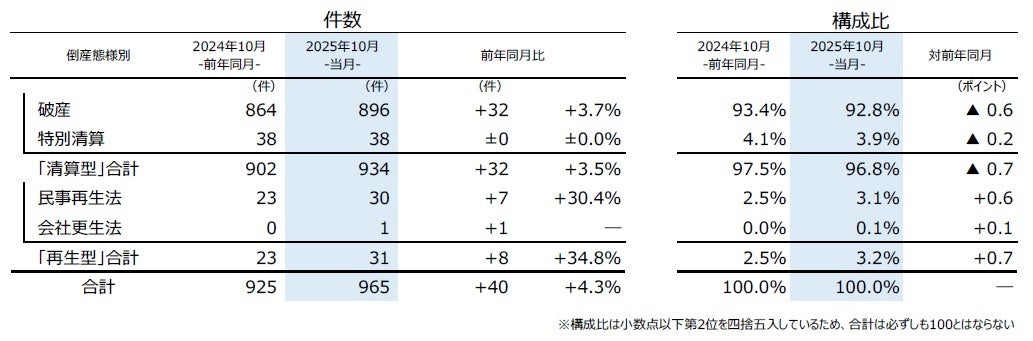 『清算型』では、「破産」が896件(前年同月864件、3.7%増)で最も多く、全体の92.8%を占めた。「特別清算」は38件(同38件)で、10月としては前年に並び、2000年以降最多タイとなった。