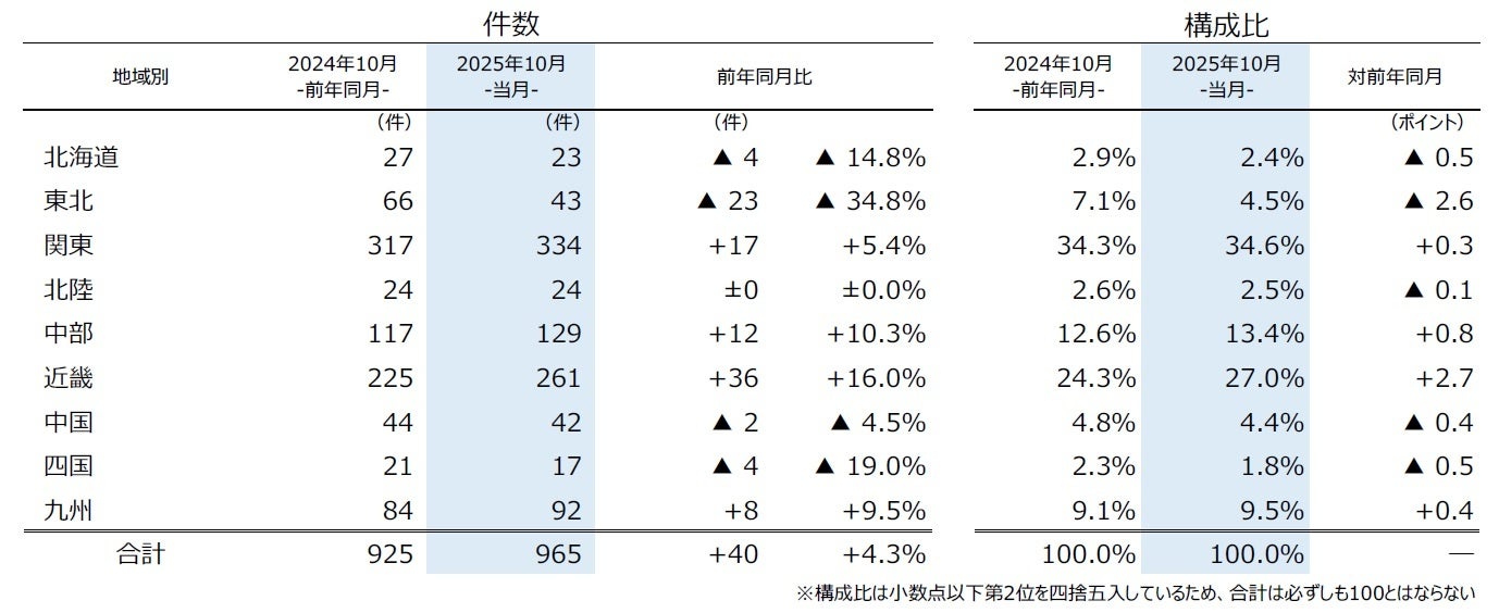 地域別にみると、9地域中4地域で前年を上回った。最も件数が多かったのは、『関東』(前年同月317件→334件、5.4%増)で、5カ月連続で前年を上回り、10月としては過去10年で最多となった。一方、『東北』(同66件→43件、34.8%減)は、2カ月ぶりに前年を下回った。