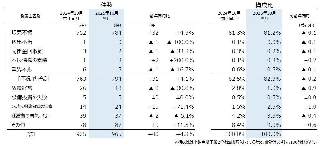主因別にみると、「販売不振」が784件(前年同月752件、4.3%増)で、10月としては過去10年で最多となった。「不良債権の累積」(前年同月1件→3件、200.0%増)は2カ月ぶりに前年を上回った。このほか、「売掛金回収難」(同3件→2件、33.3%減)などを含めた『不況型倒産』は794件(同763件、4.1%増)となり、全体の82.3%を占めた。2025年1-10月の累計は7126件で前年同期(6804件)から増加し、5期連続で前年を上回った。