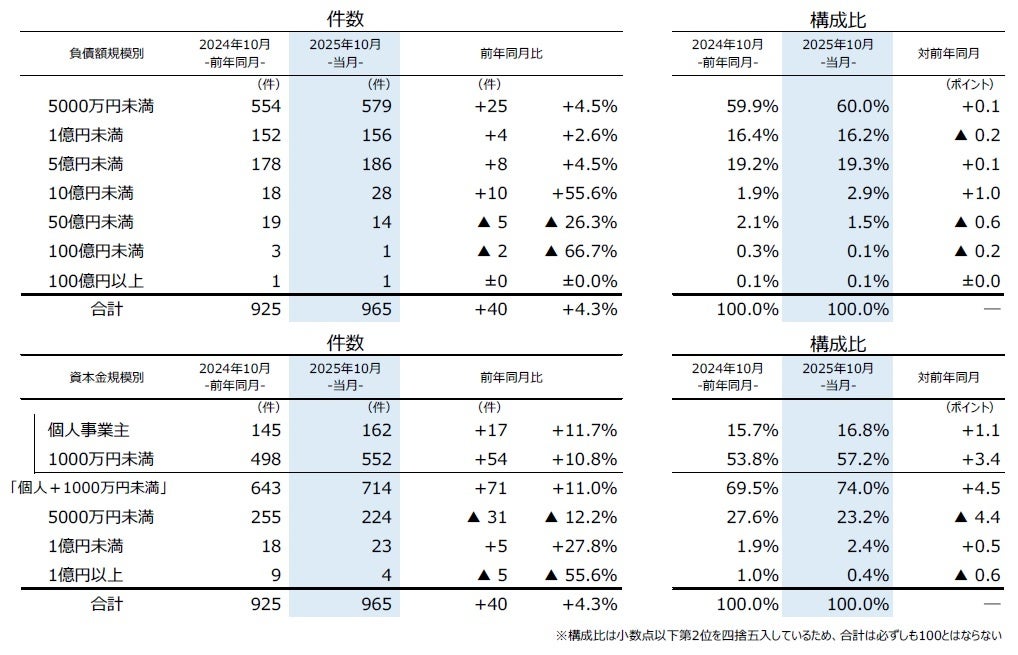資本金を規模別にみると、『個人+1000万円未満』の倒産が714件(前年同月643件、11.0%増)となり、10月としては2000年以降最多となった。