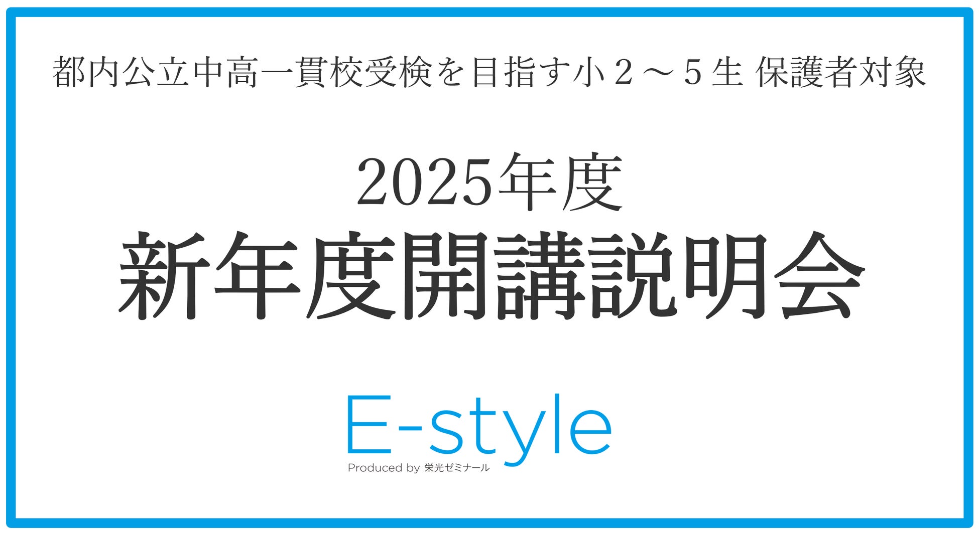 株式会社増進会ホールディングス(Z会グループ)のグループ会社、株式会社栄光(本社:東京都千代田区 代表取締役社長:下田勝昭)が運営する、都立中高一貫校と最難関都立高校対策専門塾「E-style Produced by栄光ゼミナール」は、都内公立中高一貫校をお考えの現小学2年生~5年生の保護者を対象に、「2025年度【小学部】新年度開講説明会」を2024年10月・11月に実施します。