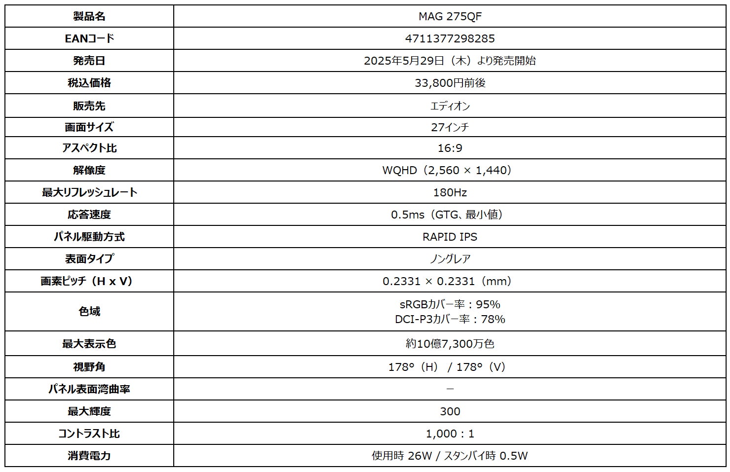この度、エムエスアイコンピュータージャパン株式会社は2025年5月29日(木)より、ゲーミングモニターの新モデルを発売いたします。高いゲーミング性能とコストパフォーマンスに優れた『MAG』シリーズから、高精細な映像でゲームが楽しめる27インチWQHD解像度、RAPID IPSパネル、リフレッシュレート180Hz、応答速度0.5ms(GTG、最小値)の「MAG 275QF」が新たにラインナップに加わります。