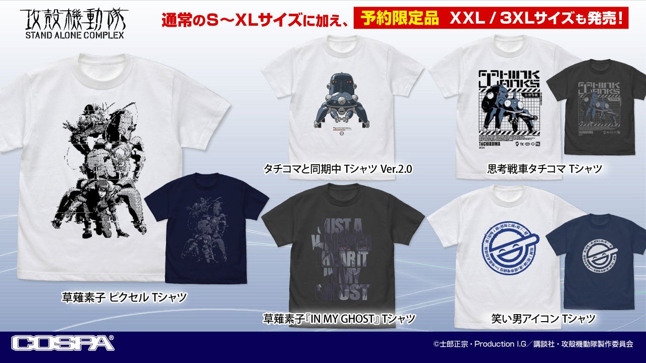 ほかにも、“草薙素子”をピクセル風にデザインしたTシャツにタチコマ、そして公安9課のロゴアイテムなど多数ラインナップ。Tシャツの大きめサイズXXL/3XLは限定品となるため予約がおススメ。