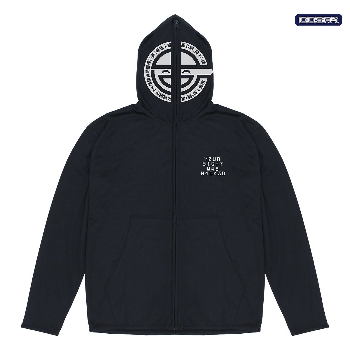笑い男アイコン フルジップパーカーは、フードを閉め切ることで劇中さながらに“笑い男にハックされた”かのようになれるアイテム。笑い男のアイコンは他にもTシャツやステンレスマグカップなど多数展開。