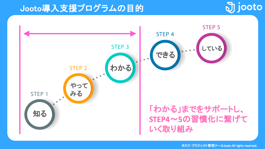 具体的には以下の5つのステップに沿って、これまでは導入企業さまご自身で実施いただいていた業務の実行支援、および代行をすることで、「Jooto」をチームで継続的にご利用いただける状態を早期に実現します。