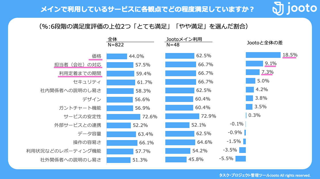 PR TIMESが実施したタスク管理ツール利用に関する調査(*)によると、「Jooto」は「価格」、「担当者の対応」、「利用定着までの期間」の項目において、他サービスを含めた全体平均に比べて高い評価をいただいていることが分かりました。「Jooto」は国産のサービスであるという特性を生かした丁寧なサポートを徹底し、特にこの1年間は導入初期から利用継続期における支援を続けています。
