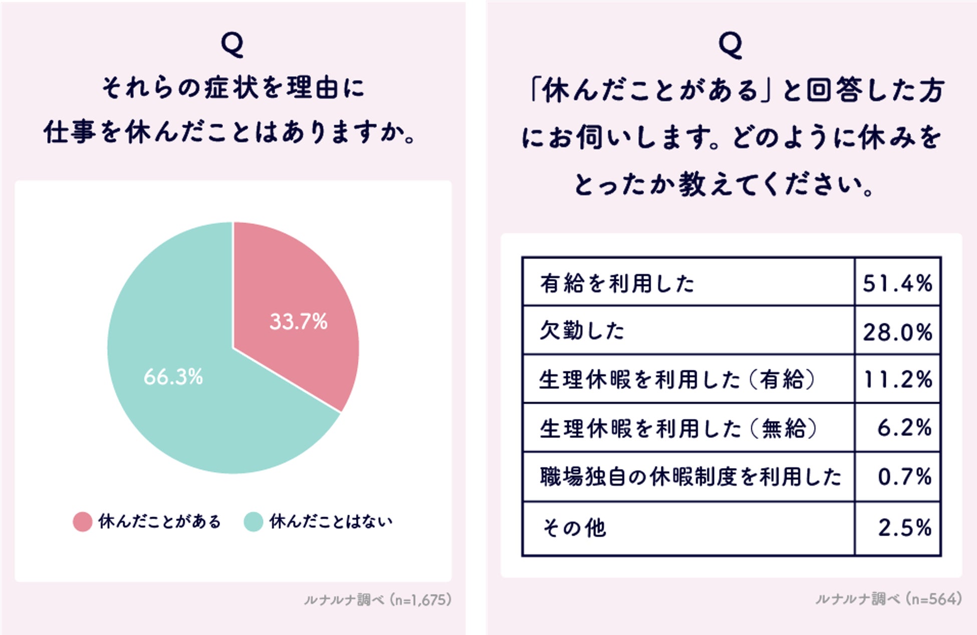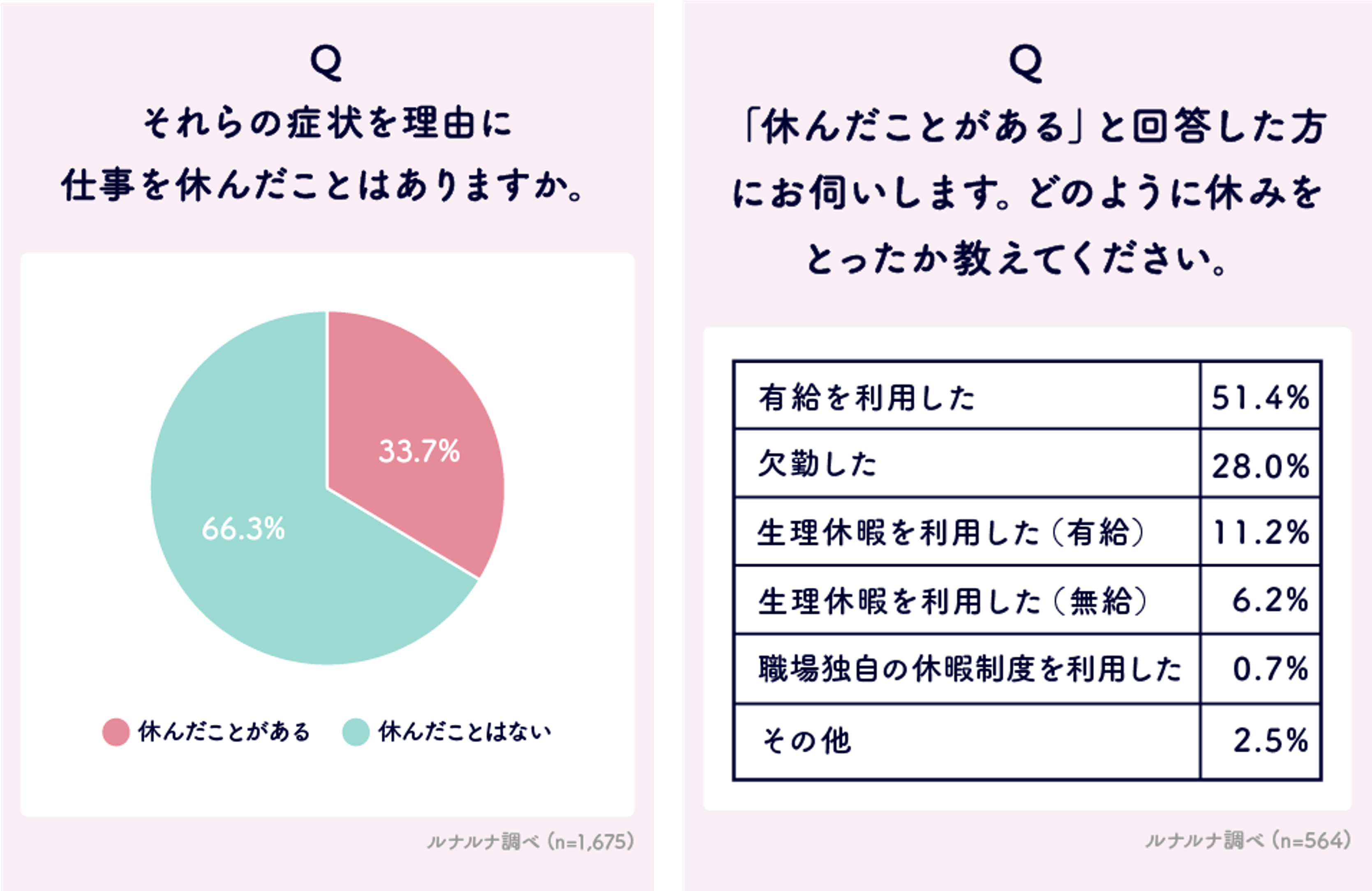 Q. それらの症状を理由に仕事を休んだことはありますか。/ Q. 前問で「休んだことがある」と回答した方にお伺いします。どのように休みをとったか教えてください。