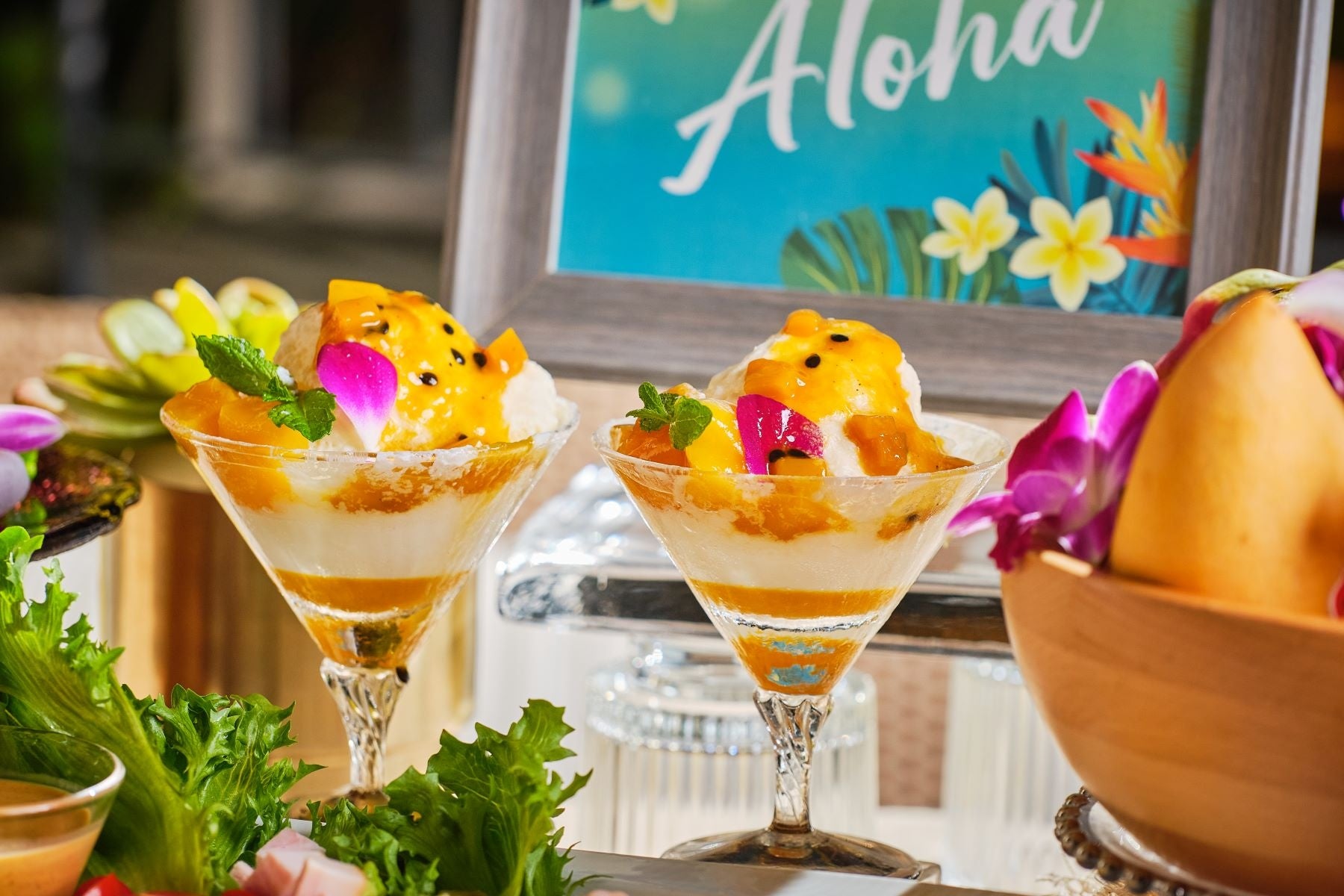 最後のデザートとしてお召しあがりいただく南国風かき氷は、ハワイをイメージとしたフルーツ“マンゴー”と“パッションフルーツ”をふんだんに使用した甘酸っぱいソースとふわふわの氷が口の中で溶け合い、南国リゾート気分を味わうことができます。