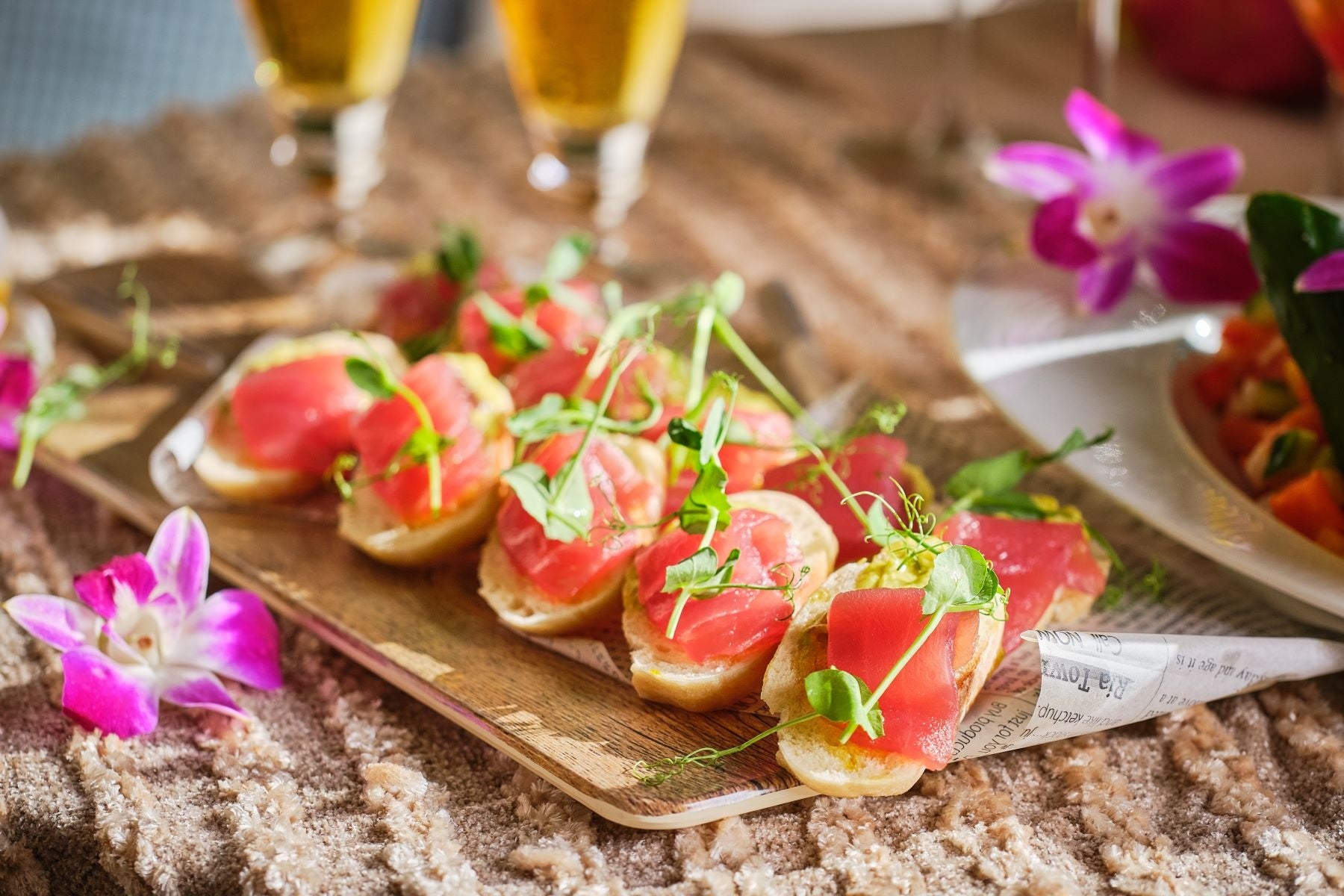 結婚式の料理を担うシェフが監修した料理は、見た目がカラフルで華やかなロミロミサーモンをはじめ、マグロのうまみとバケットのカリっとしたサクサクがアクセントとなったアヒポキブルスケッタ、具材がごろごろ入ったコブサラダボウルなど、彩り豊かな前菜プレートをご用意。
