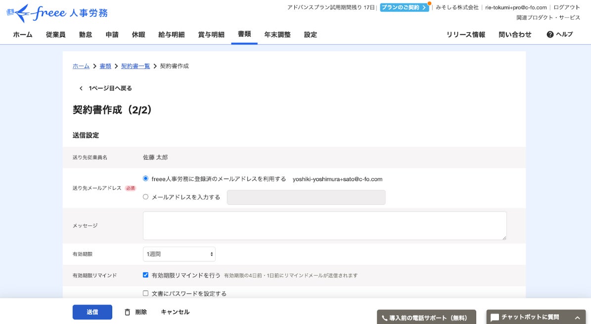 ・「従業員詳細」「契約書作成画面」いずれかから契約書を作成、送信します