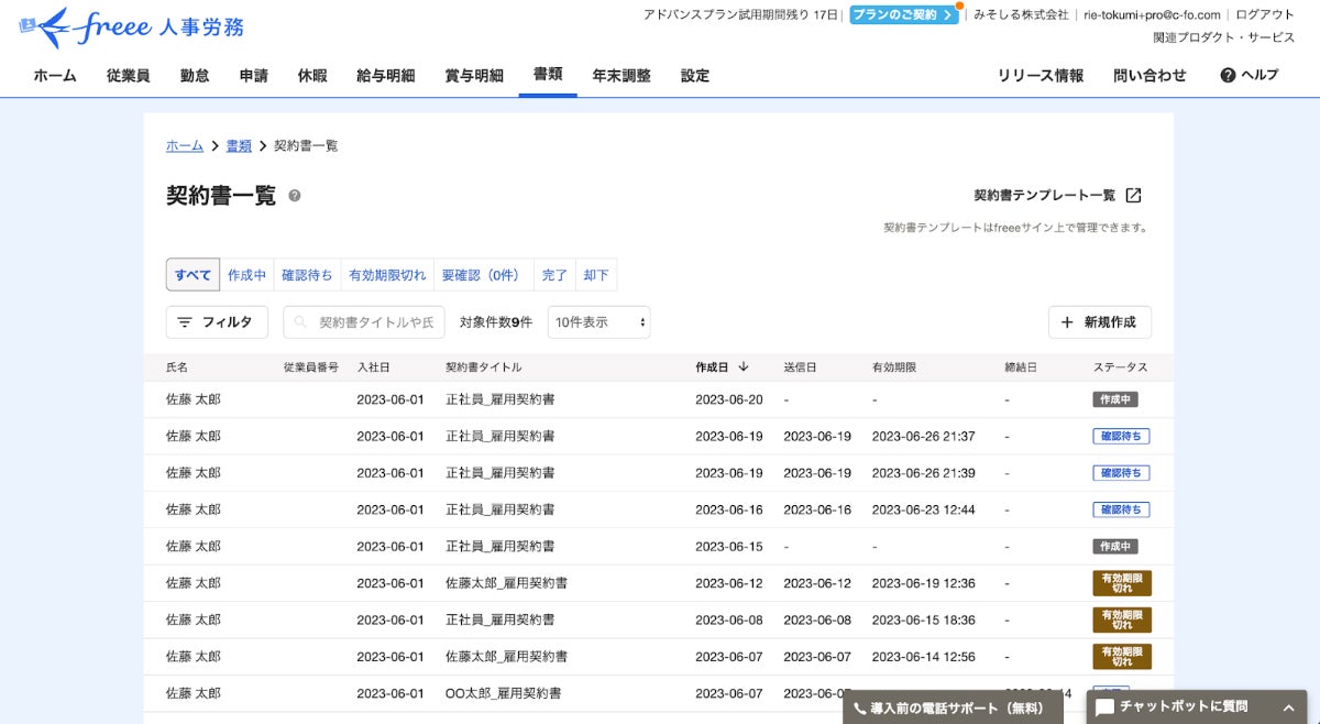 ・作成した契約は、freee人事労務上でステータスを一元管理できます