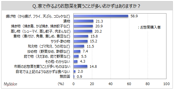 【お惣菜に関する調査】お惣菜を週1回以上購入する人は6割弱、2019年調査より増加。家で作るよりお惣菜を買うことが多いおかずは「揚げ物」が惣菜購入者の6割弱、「漬物」「焼き物」が各2割強