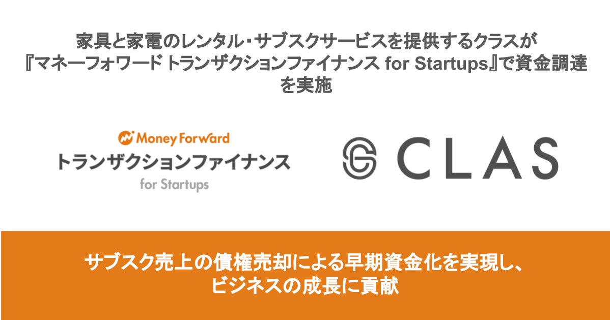 マネーフォワードケッサイ株式会社は、家具と家電のレンタル・サブスクリプション「CLAS(クラス)」を運営する株式会社クラスが、スタートアップ向け資金調達サービス『マネーフォワード トランザクションファイナンス for Startups』を利用して資金調達を実施したことをお知らせいたします。
