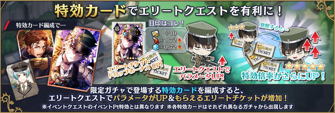 今回のイベントからレアリティやカードによって発生する特効や特効の倍率が異なりますので、詳しくはゲーム内イベントクエスト画面内の「攻略のヒント」をご確認ください。