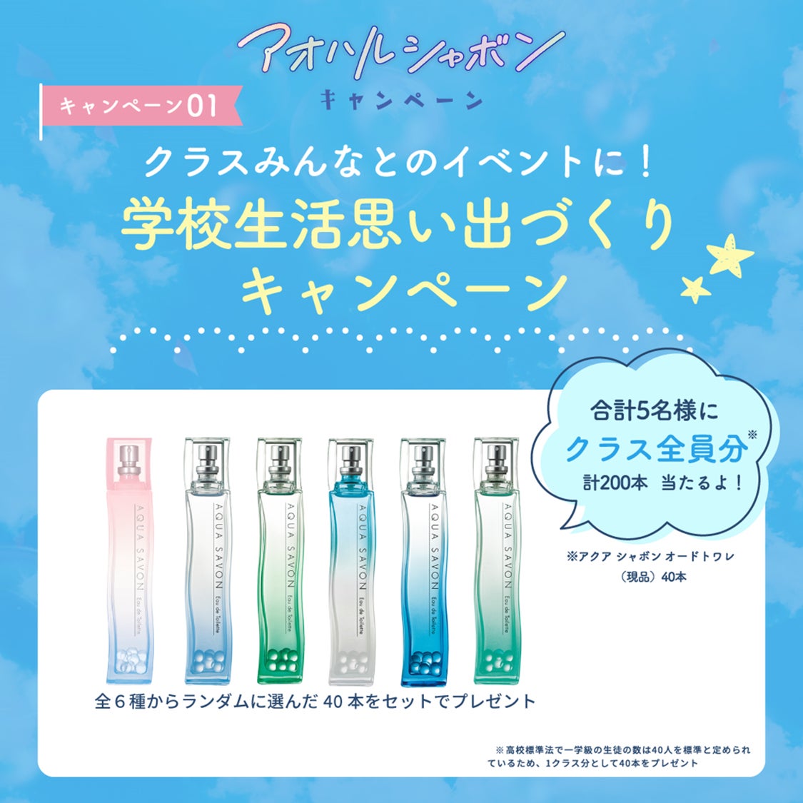 『4月8日 シャボンの香りの日』に青春の情景を表現した「学校、制服、放課後、アオハルの香り」の「オードトワレ」「ヘアー&ボディミスト」限定発売を記念したキャンペーンは、アオハルな写真や動画を投稿。抽選で5名様にクラス全員分にあたる40本(※2)の「アクア シャボン オードトワレ」をプレゼントいたします。