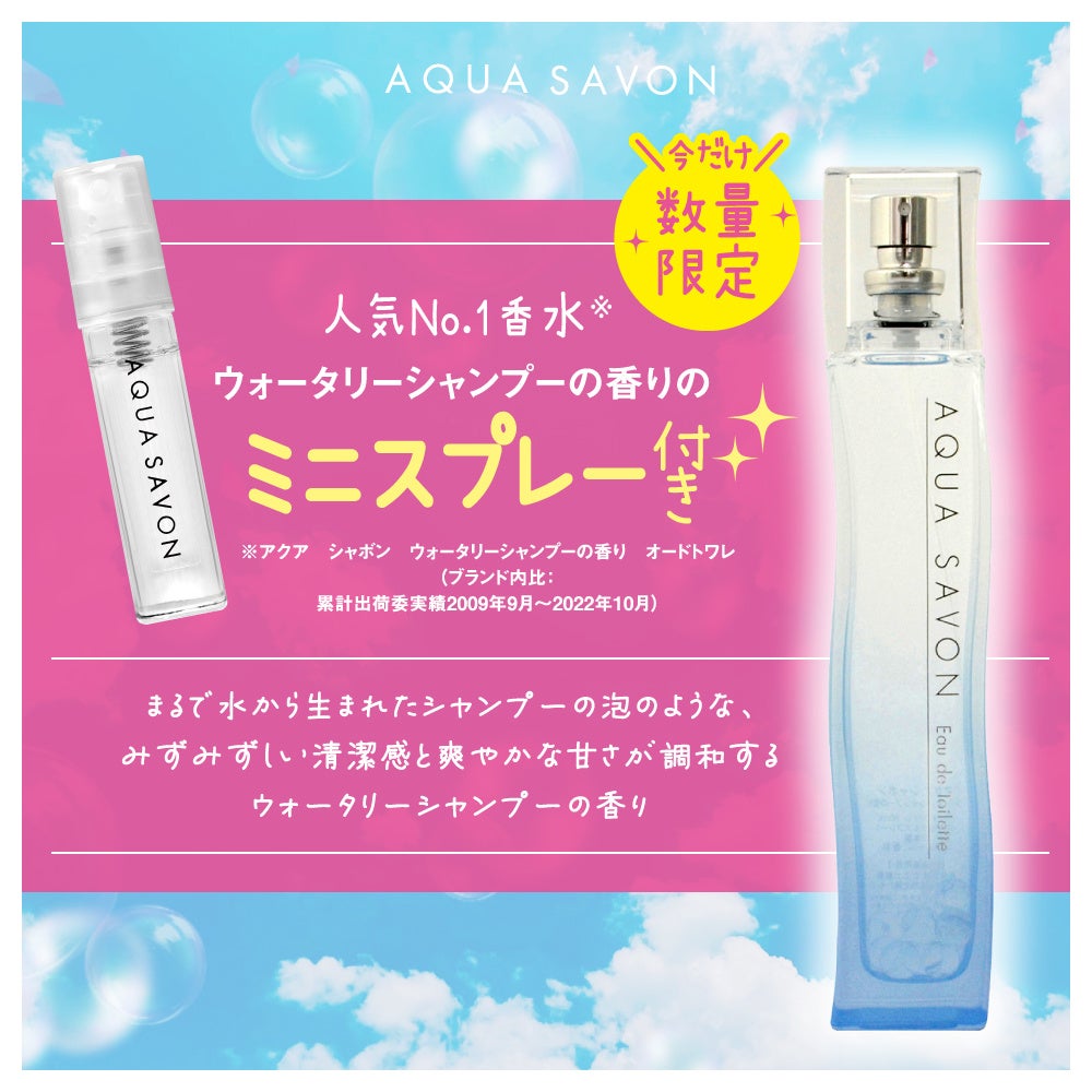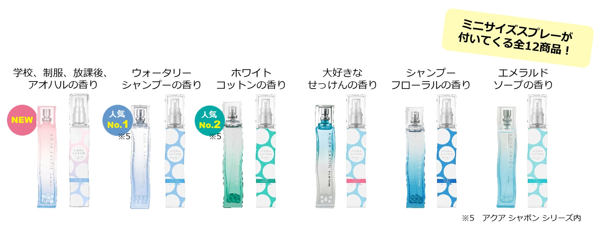 アクア シャボンを代表する人気No.1 (※3)の香り「ウォータリーシャンプーの香り」オードトワレのミニスプレー(2.5mL)付き。持ち歩きにも嬉しいお試しサイズスプレーです。新商品をはじめ、人気TOP5 (※3)の香りの「オードトワレ」「ヘアー&ボディミスト」全12商品に付いてきます。