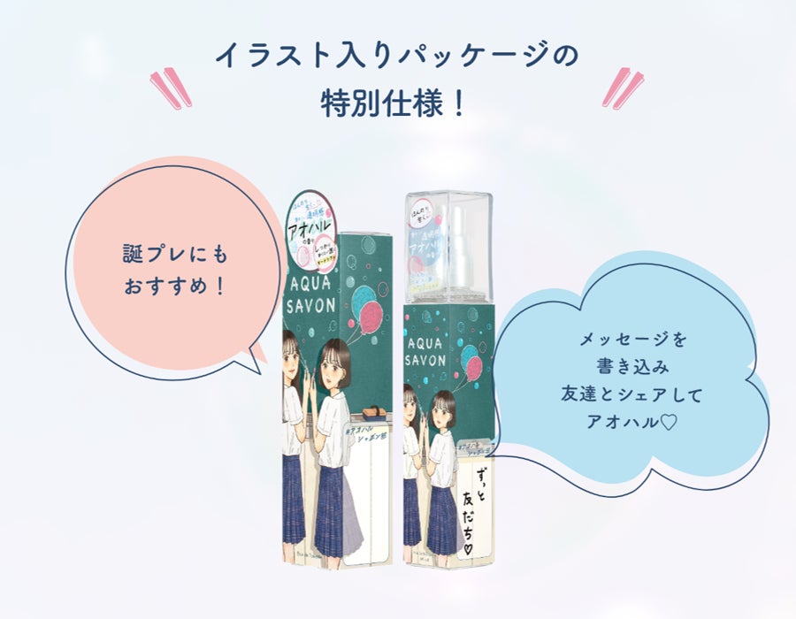 「学校、制服、放課後、アオハルの香り」は香り名となっている学校生活のアオハルな情景をイラストで表現した、特別デザインのパッケージが付いてきます。側面のメッセージスペースには、自分や友人へのメッセージを書き込んでカスタムができます。