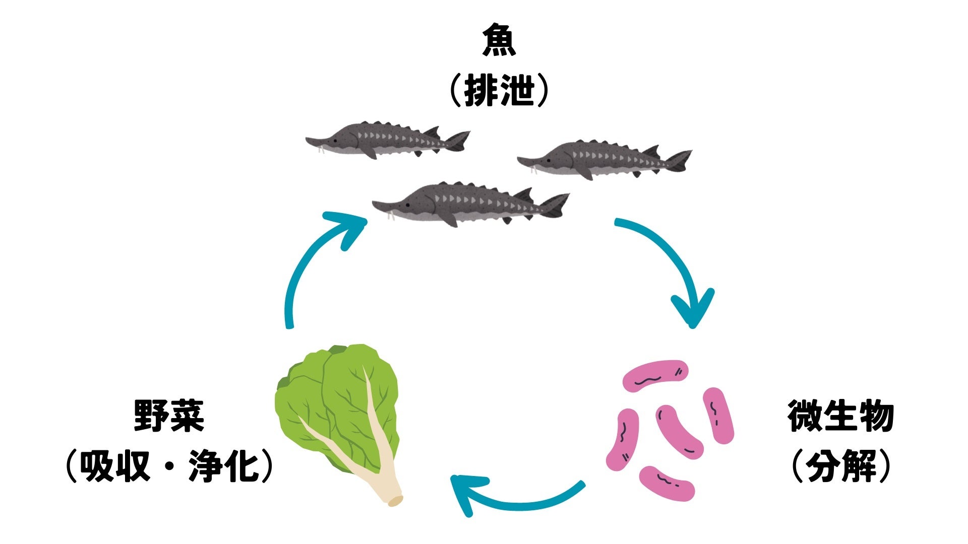 アクアポニックスは、水産養殖(A quaculture )と水耕栽培Hydroponics )を掛け合わせた農業です。魚の排泄物を微生物が分解し、植物がそれを栄養として吸収、浄化された水が再び魚の水槽へと戻る、生産性と環境配慮の両立ができる生産システムです。農薬や化学肥料などを一切使用していないため安全性が高い農法です。