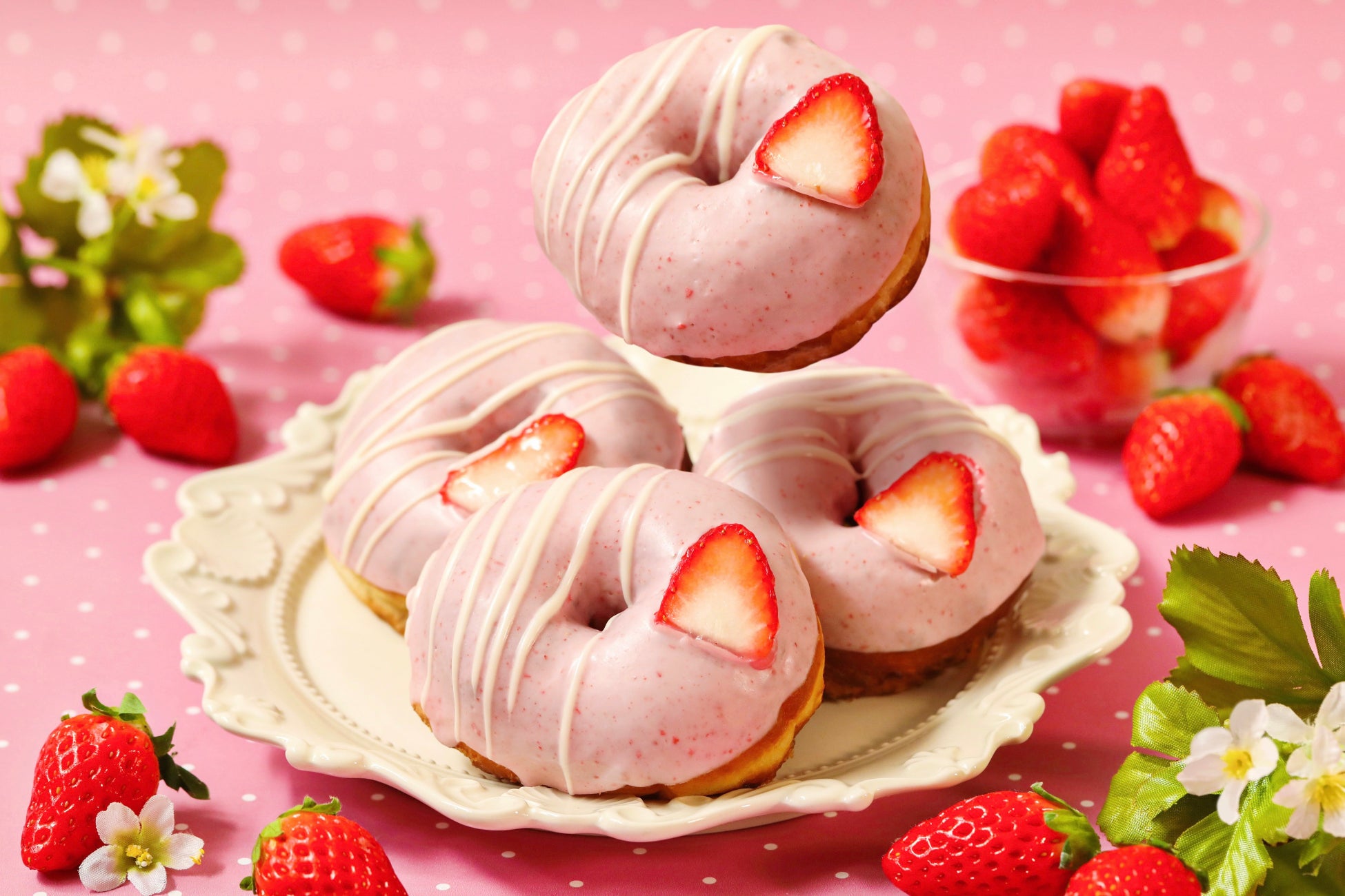 小麦を使用した“ふわっ、とろっ”食感の生ドーナツ生地にいちご風味をまとわせて、ホワイ