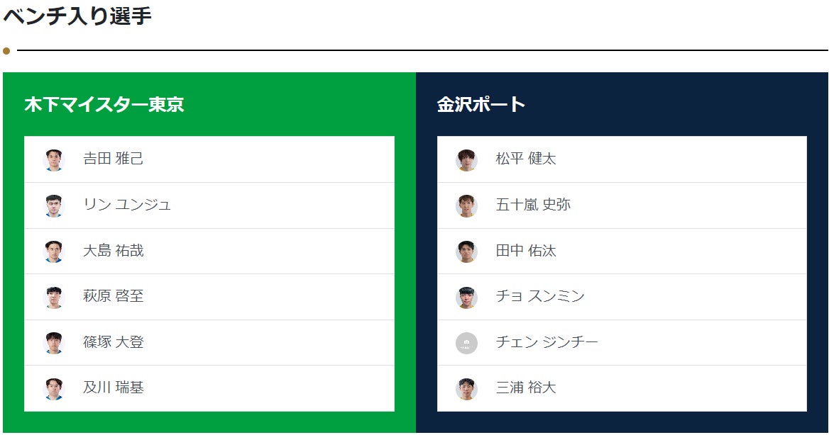 ノジマTリーグ 2023-2024シーズン 公式戦 11月12日開催 木下マイスター東京 vs 金沢ポートベンチ入り選手発表