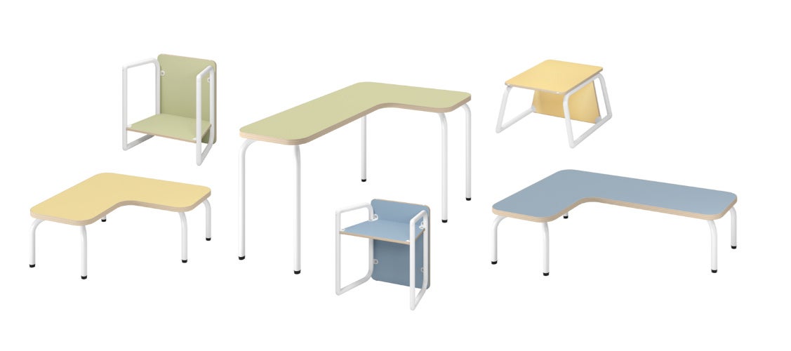 テーブルとスツールは、置き方や向きを変えることで、机になったりイスになったりと異なる用途で使うことが可能。子ども自らが学びや人数に応じて柔軟に学習環境を構築し、自由に活動することをサポートします。バリエーションは、テーブルは3タイプ、カラーは天板3色、脚1色をご用意。 スツールは1タイプ、カラーは3色を取り揃えています。