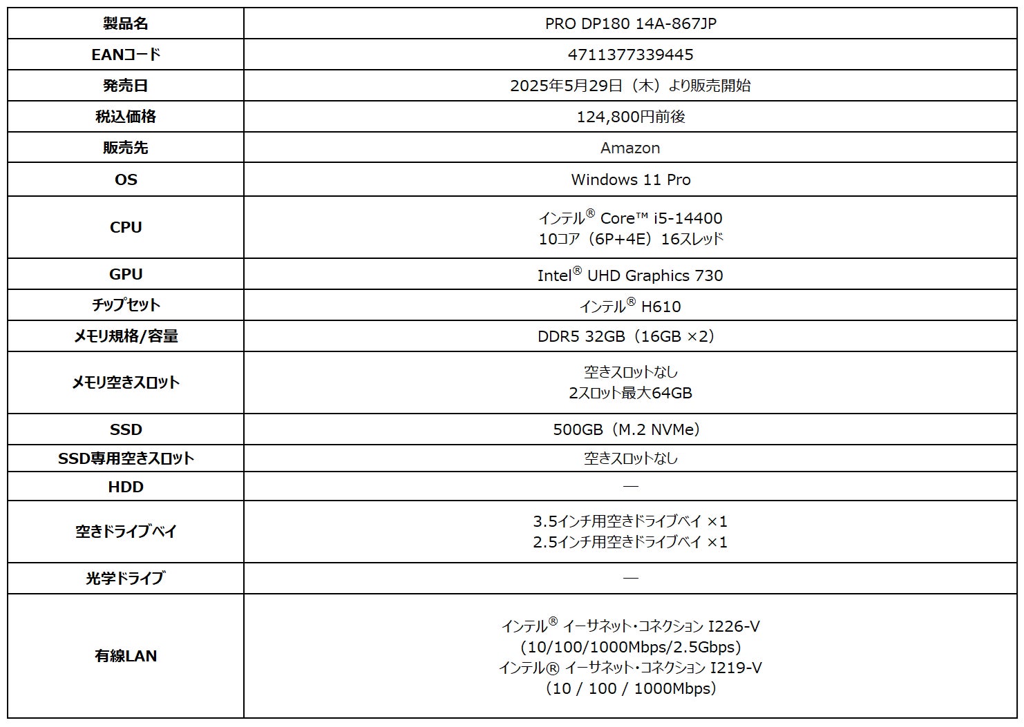 この度、エムエスアイコンピュータージャパン株式会社は2025年5月29日(木)よりビジネス向けデスクトップPCブランド『PRO DP』シリーズより、第14世代インテル® Core™ i5-14400、大容量32GBメモリ、超高速SSDを搭載し、ビジネス用途に最適なWindows 11 Proプリインストール済みモデル「PRO DP180 14A-867JP」が新たにラインナップに加わります。