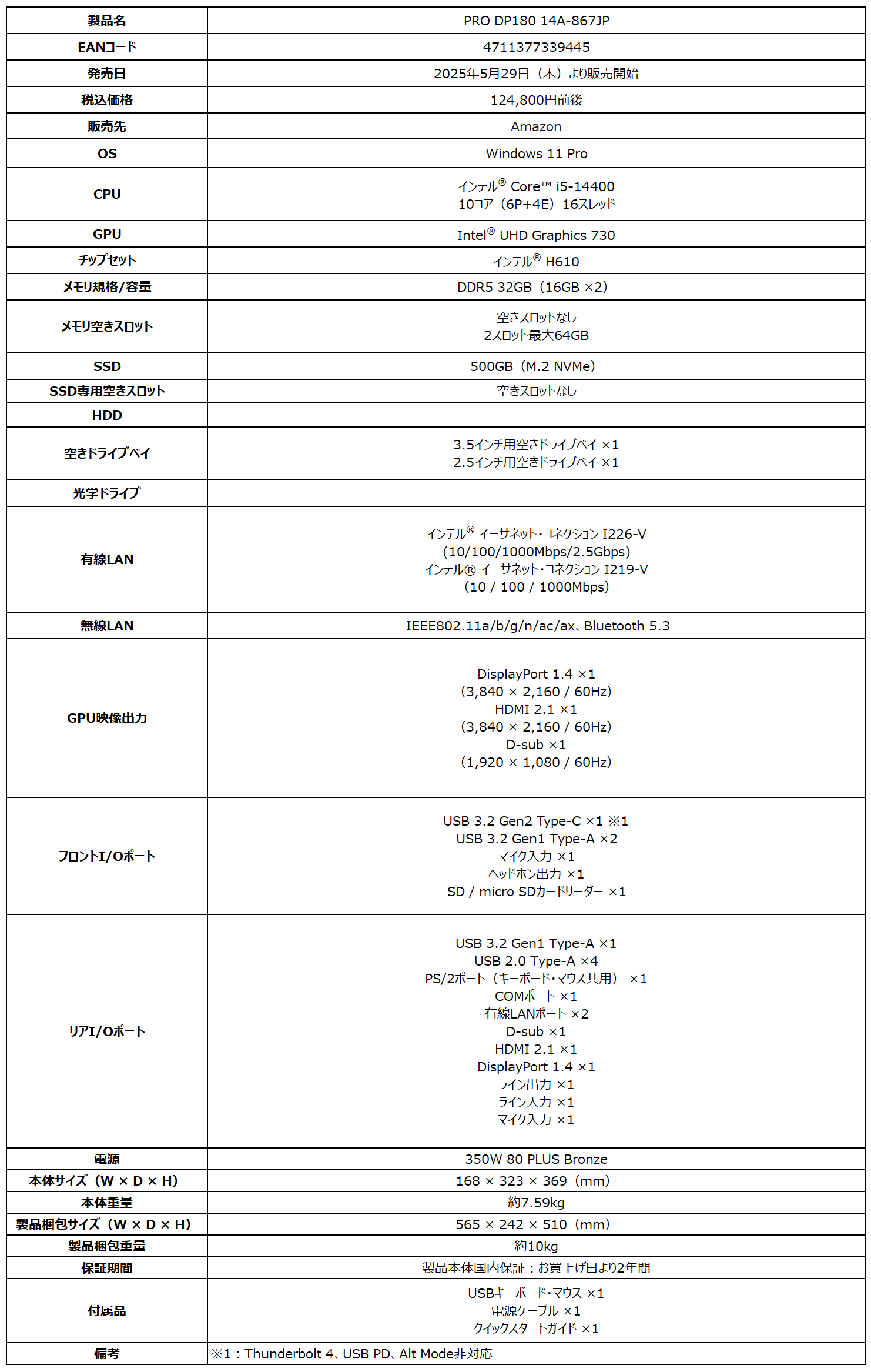 第14世代 インテル® Core™ プロセッサー、大容量32GBメモリ搭載 ビジネス用途に最適なWindows 11 Proプリインストール済み 「PRO DP180 14A-867JP」発売