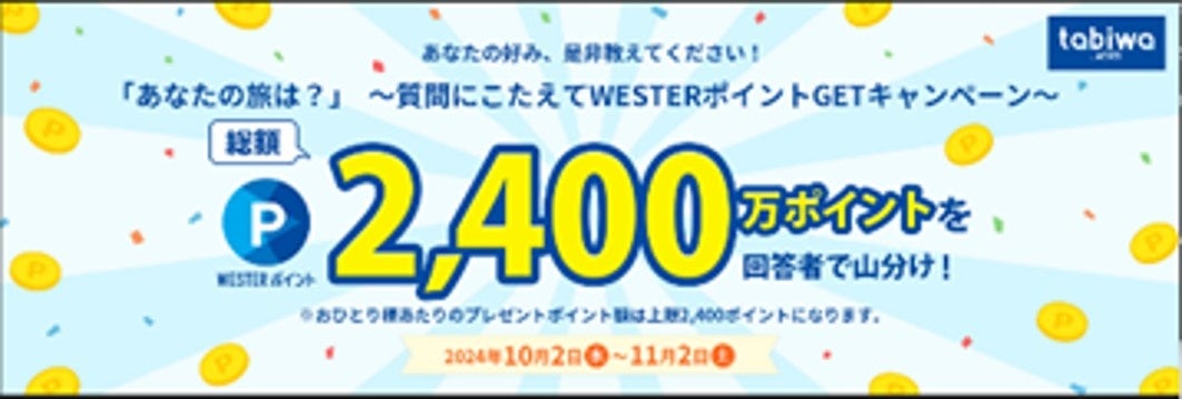 観光ナビ「tabiwa by WESTER」内で回答!参加者で、tabiwaでも使えるWESTERポイント総額2,400万ポイントを山分けして、もれなく進呈!
