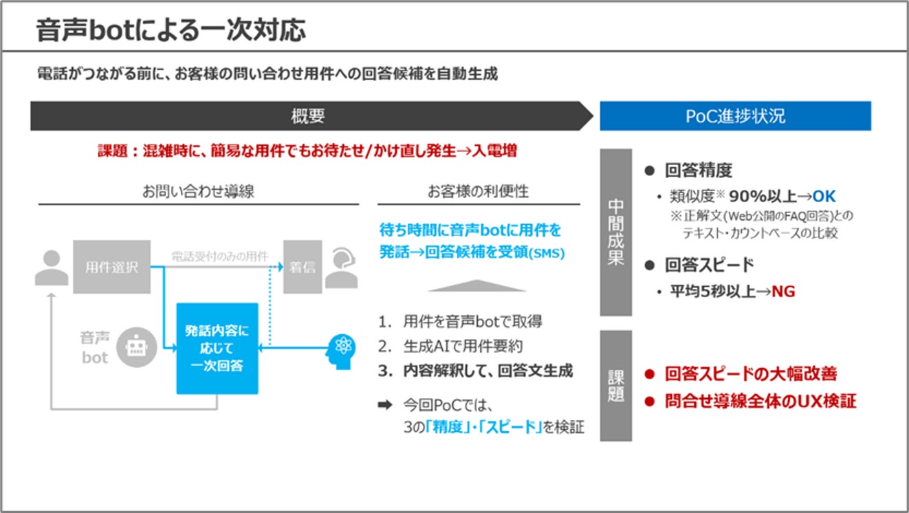 お客様からの問い合わせ窓口において、電話がつながる前に音声botでお問い合わせ用件をプレ・ヒアリング、最適な回答候補を自動生成するPoCに取り組み中。中間成果として、回答精度9割以上という結果であるものの、回答スピードは平均5秒以上かかっており、プロンプトの改善などで大幅短縮を見込んでいます。