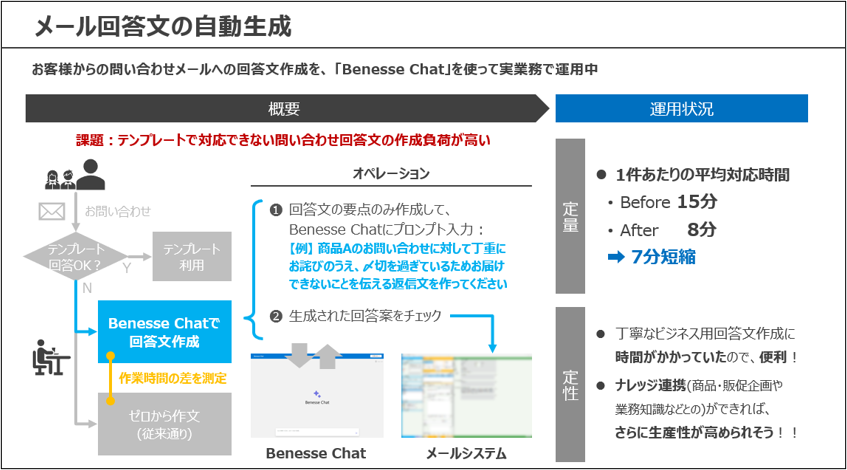 お客様からの問い合わせメールへの回答文作成において「Benesse Chat」を活用。回答テンプレートが利用できないイレギュラーな問い合わせについて、これまでオペレーターがゼロから文章作成していましたが、Benesse Chatに要点を入力して回答案を自動作成。これにより1件当たりの平均対応時間を15分から8分へ短縮することができています。
