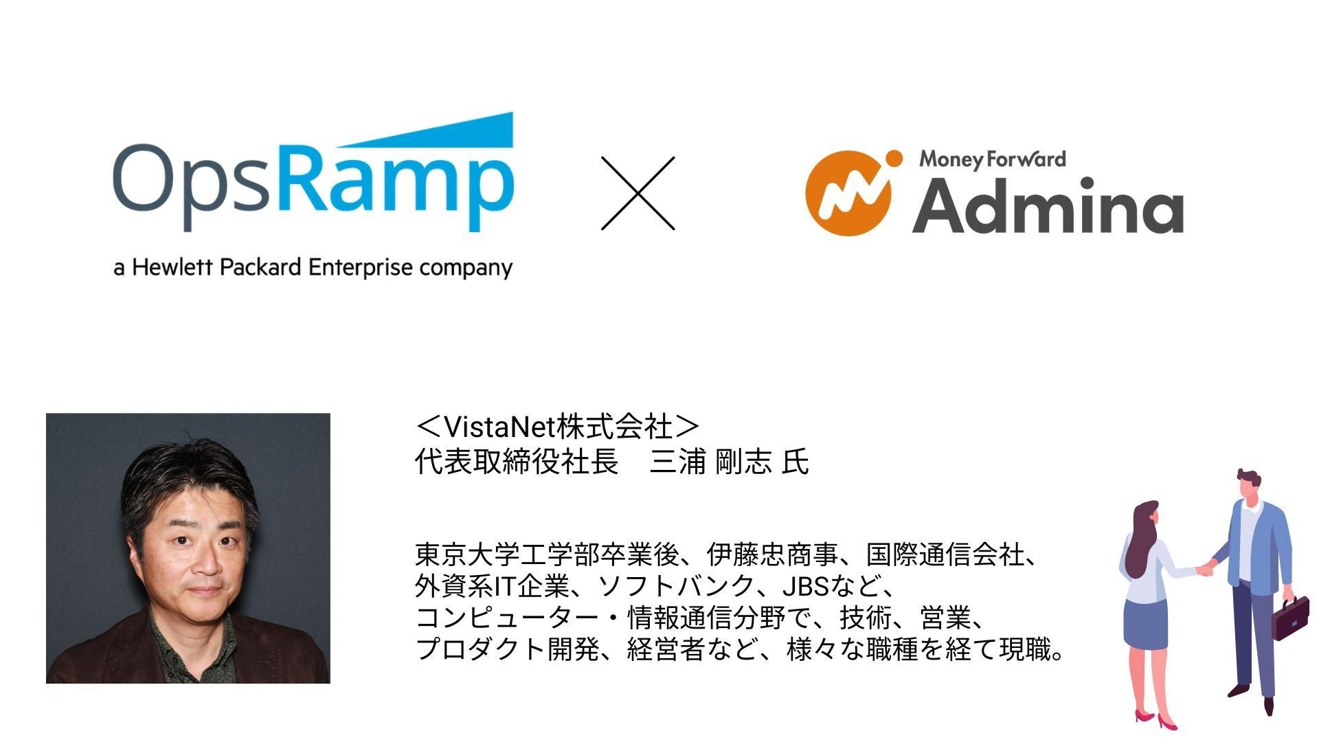 VistaNet株式会社は、ヒューレット・パッカード・エンタープライズが提供するIT運用管理 (ITOM) ソリューション『OpsRamp』の、日本の代理店です。クラウドとIT運用に関する管理という潜在課題を抱える企業に対し、『マネーフォワード Admina』の特性である「クラウド(IaaS)のID管理」と、『OpsRamp』の特性である「ITリソースやアプリケーションの管理」を掛け合わせ、クラウドとIT運用に関する管理課題をトータルで提案します。