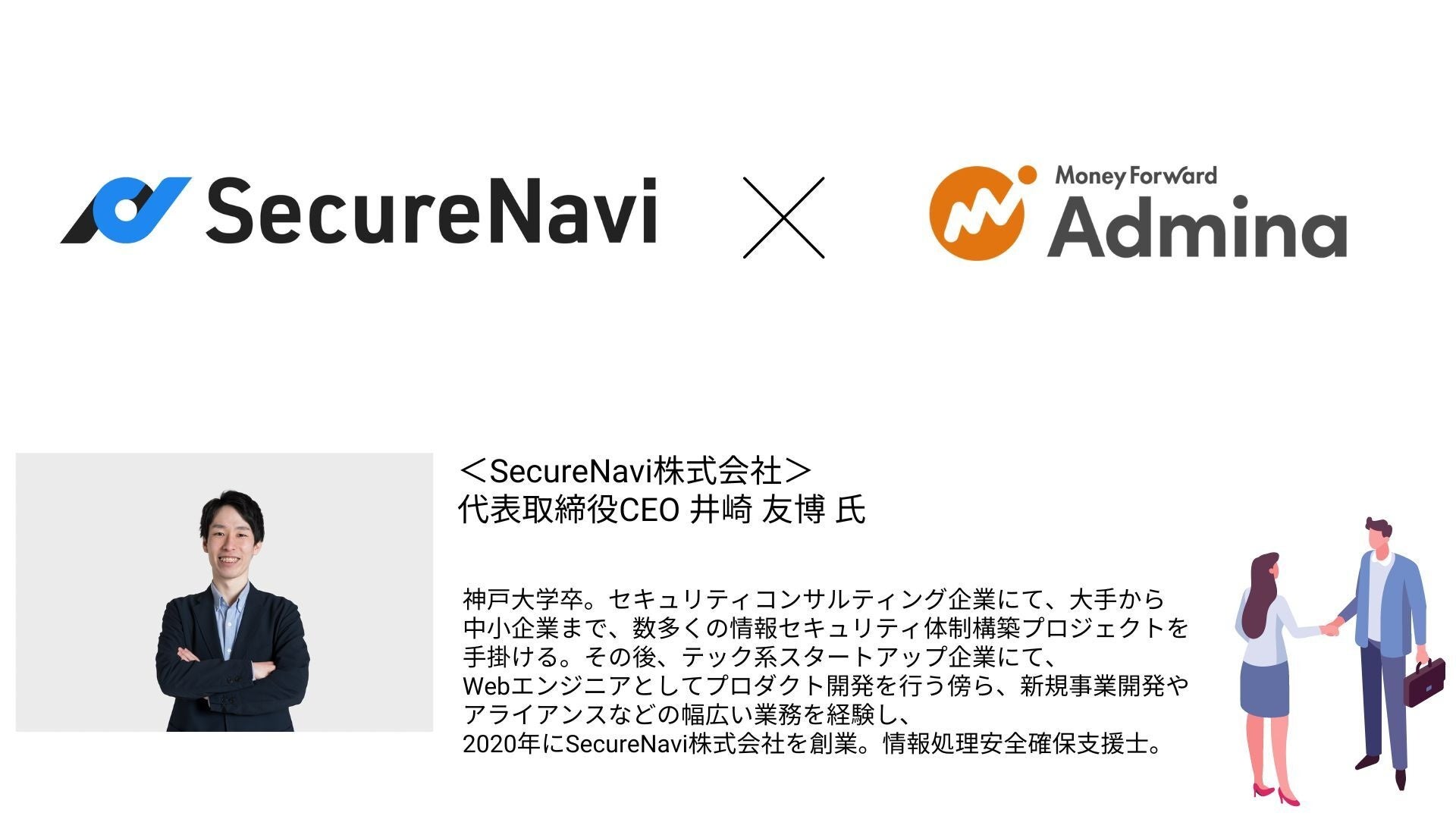 当社は、SaaSやITデバイス管理の課題を解決する、『マネーフォワード Admina』を提供しています。今後は、『マネーフォワード Admina』を情シス向け業務OSとしてより価値あるサービスにするため、他社とのパートナー提携を積極的に行ってまいります。パートナーを通じ、より多くの企業に『マネーフォワード Admina』を届けられるほか、技術連携など、両社の強みを掛け合わせてシナジーを生み出したいと考えています。なおこれまでに「VistaNet株式会社」、「SecureNavi株式会社」との提携を開始しています。
