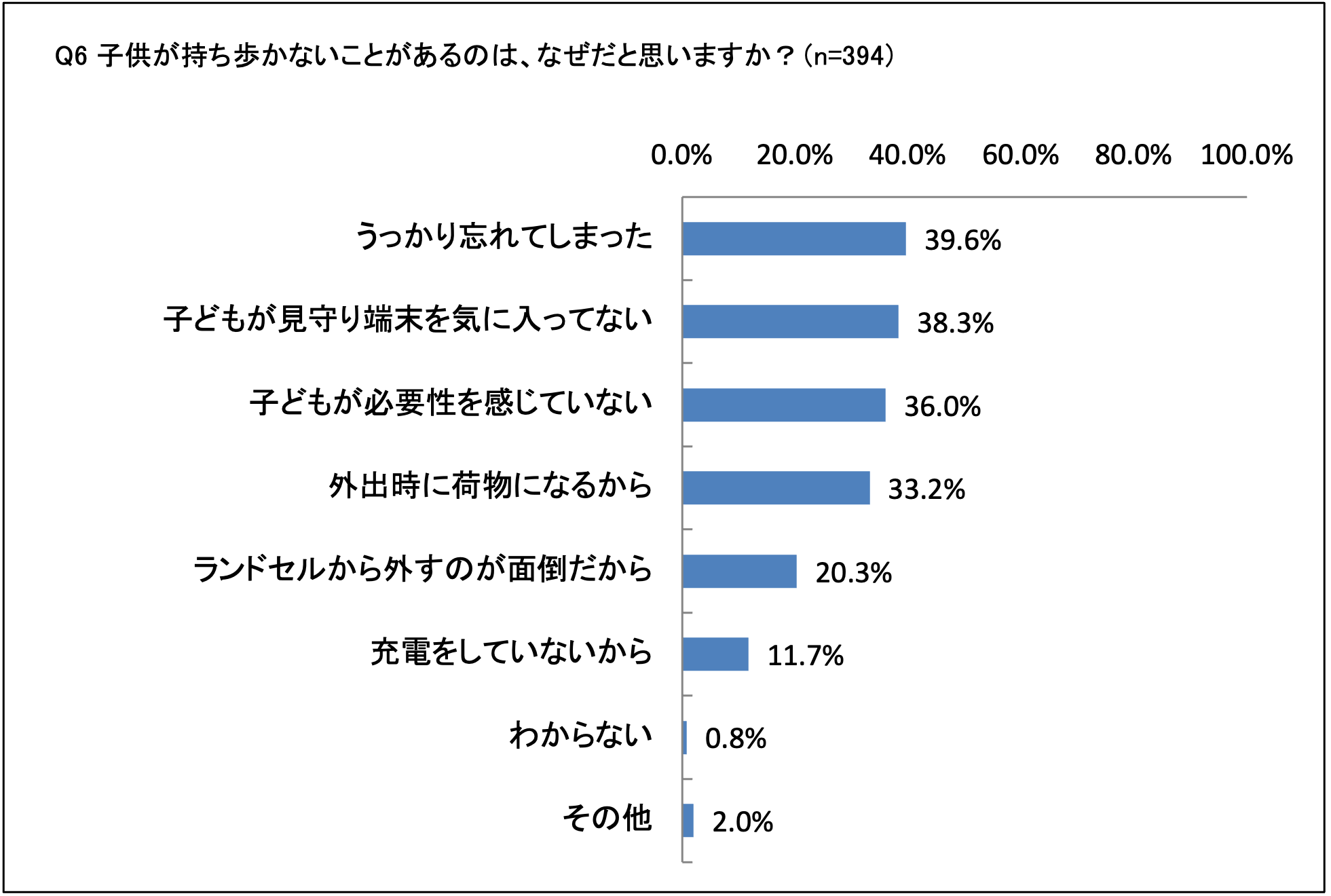 なぜ持ち歩かないことがあるのか、親目線で考えられる理由としては、「うっかり忘れてしまった」(39.6%)というシンプルな理由だけでなく、「子どもが見守り端末を気に入っていない」(38.3%)、「子どもが必要性を感じていない」(36.0%)、「外出時に荷物になるから」(33.2%)などの回答が上位を占めており、見守り端末に対する子どもの関心が低いことが伺えます。