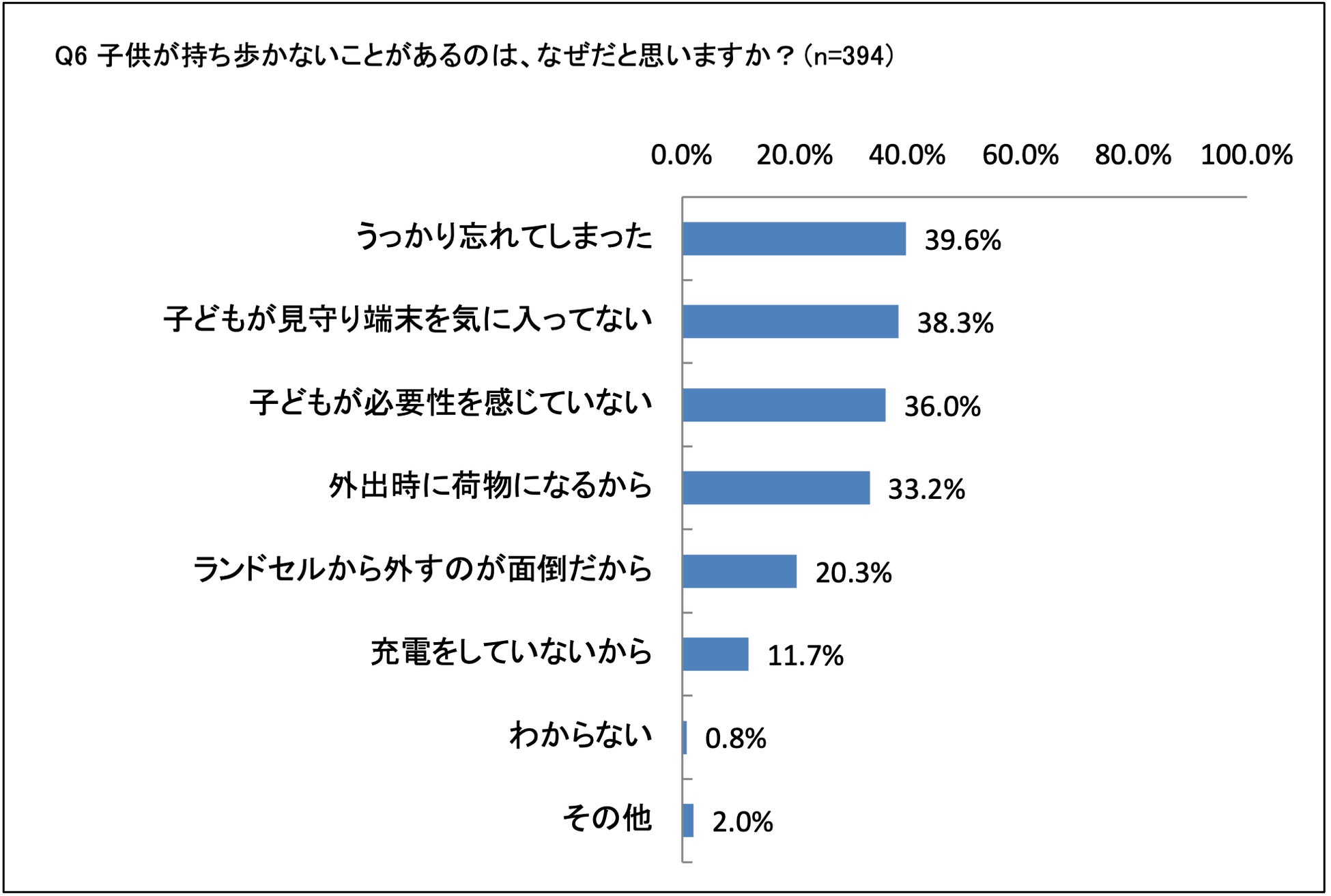 子どもが見守り端末を持ち歩かないことがある理由としては、「うっかり忘れてしまった」(39.6%)が最多。「子どもが見守り端末を気に入ってない」(38.3%)、「子どもが必要性を感じていない」(36.0%)など、見守り端末に対する子どもの関心が低い傾向